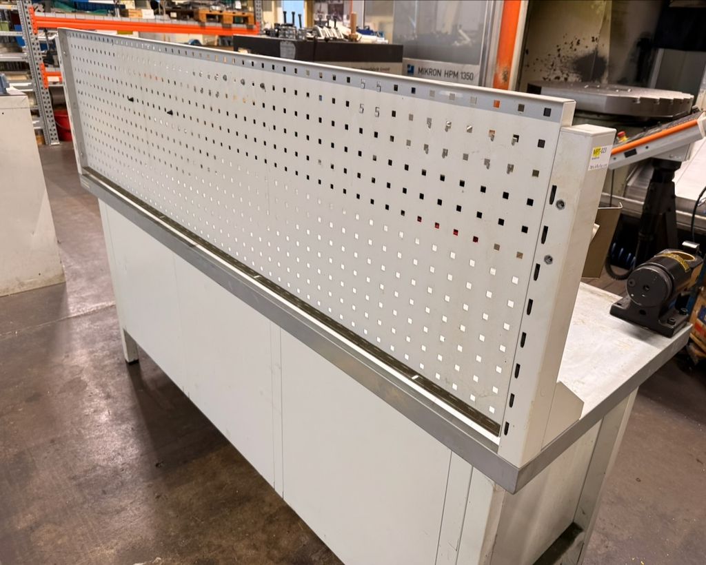 Stabile Industrie-Werkbank der Marke ANKE mit verzinktem Stahlblechbelag und Lochplatten-Aufsatz.