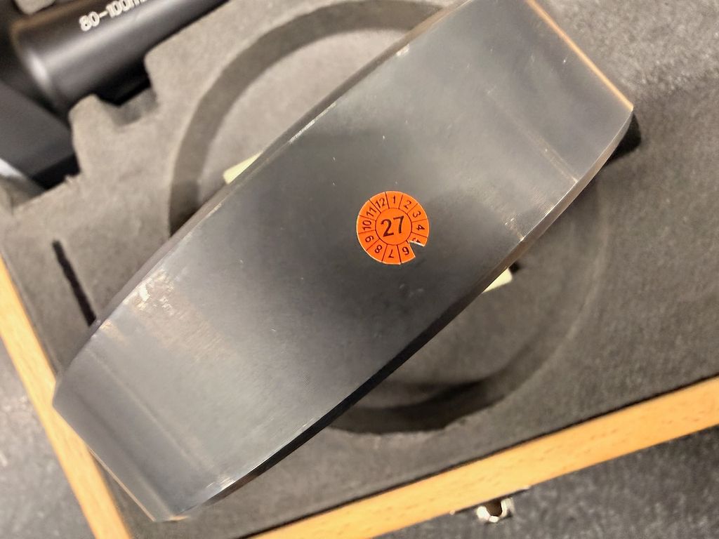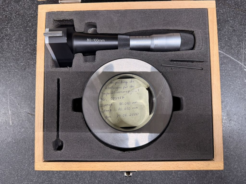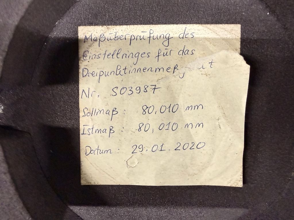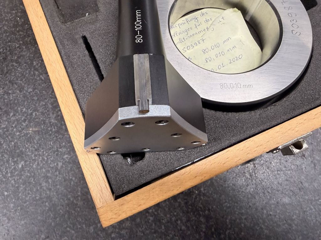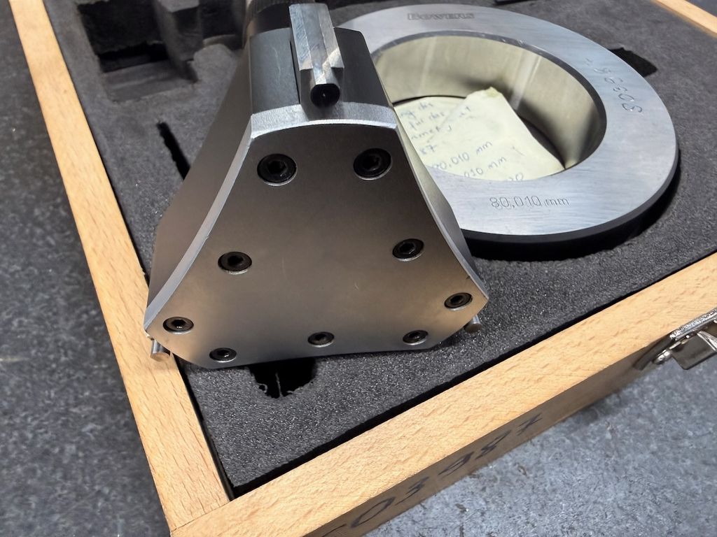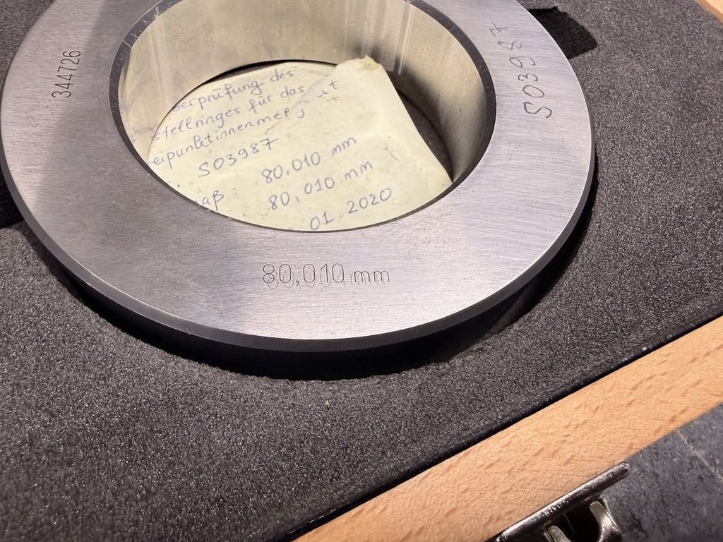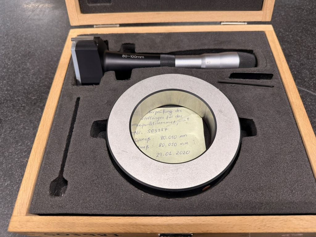 Lieferung inklusive originalem Einstellring 80,010 mm, Zubehör und Holzkasten.