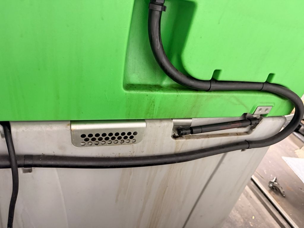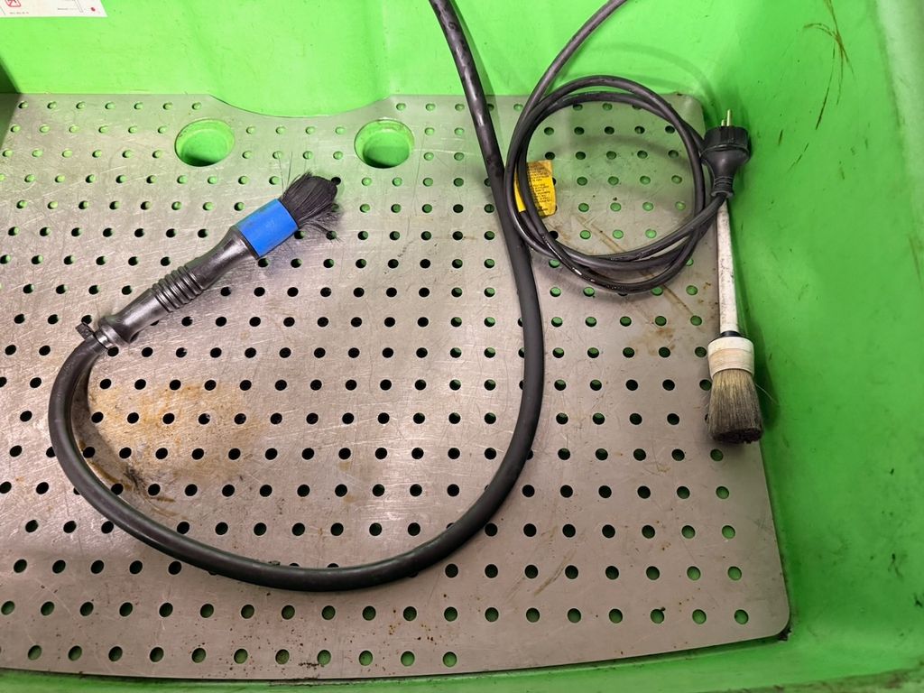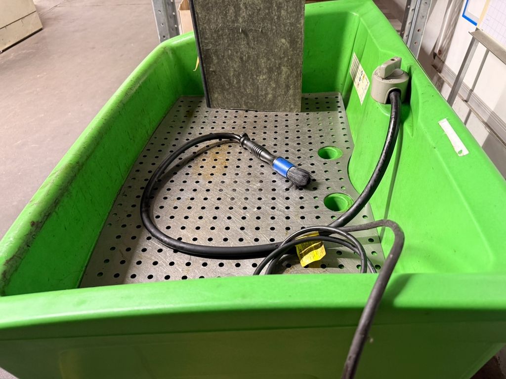 Stationäres Teilereinigungsgerät zur manuellen Reinigung von Bauteilen mit wässrigen Reinigungsmedien. Ausführung mit integrierter Pumpe, Waschpinsel und perforierter Ablagefläche. Geeignet für Wartung, Instandhaltung, Werkstatt- und Industriebereiche. Gerät stammt aus industriellem Einsatz.