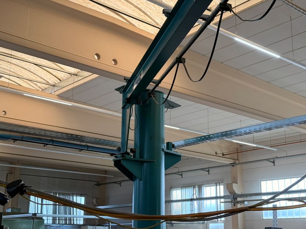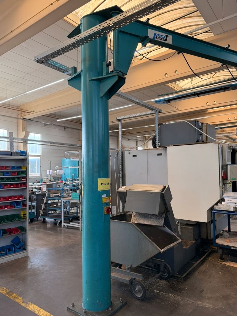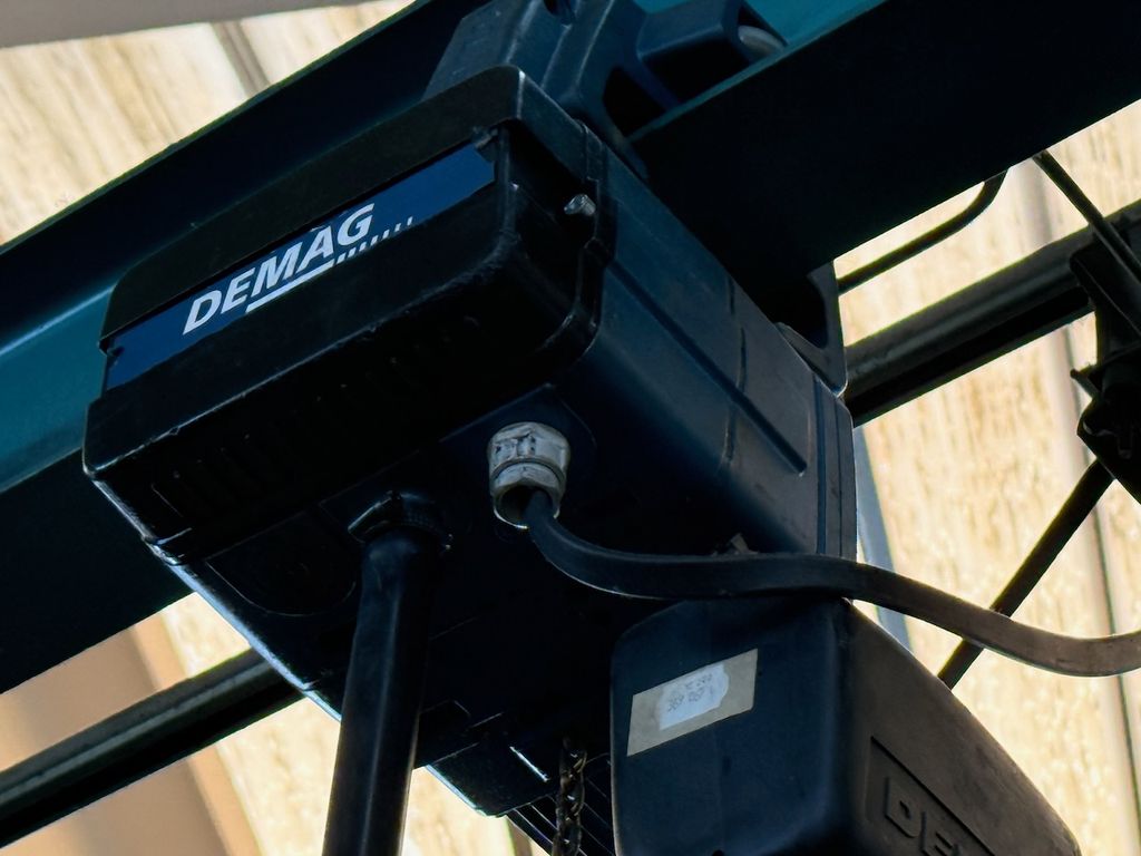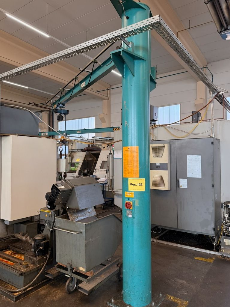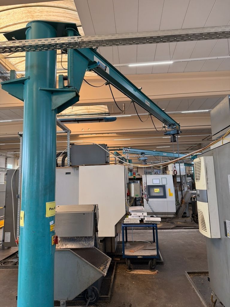 Der installierte Ausleger ist für 250 kg Traglast ausgelegt und mit einem Elektrokettenzug Demag (0,25 t) ausgestattet. Die Katzfahrt am Ausleger erfolgt manuell, ebenso die Schwenkbewegung über die Säule. Bedienung über Hängetastersteuerung.