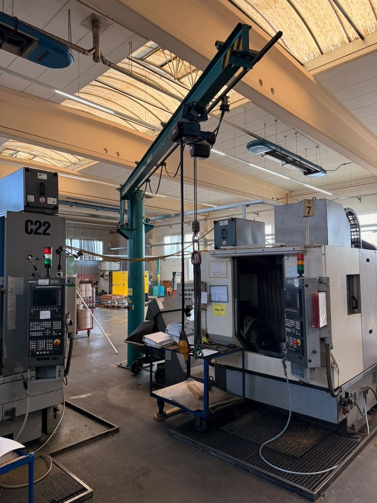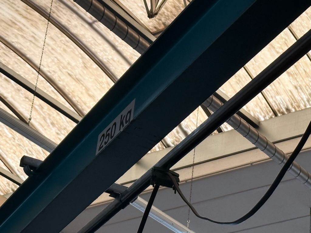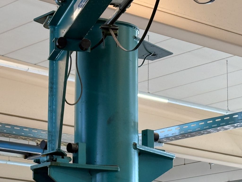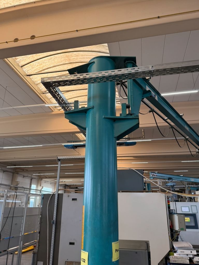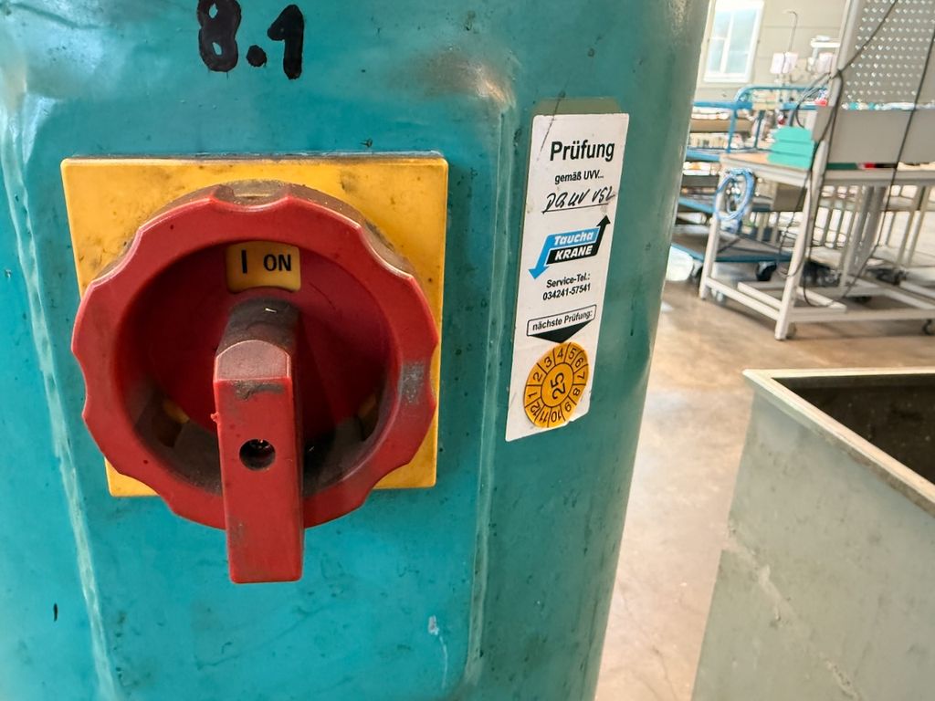 Der installierte Ausleger ist für 250 kg Traglast ausgelegt und mit einem Elektrokettenzug Demag (0,25 t) ausgestattet. Die Katzfahrt am Ausleger erfolgt manuell, ebenso die Schwenkbewegung über die Säule. Bedienung über Hängetastersteuerung.