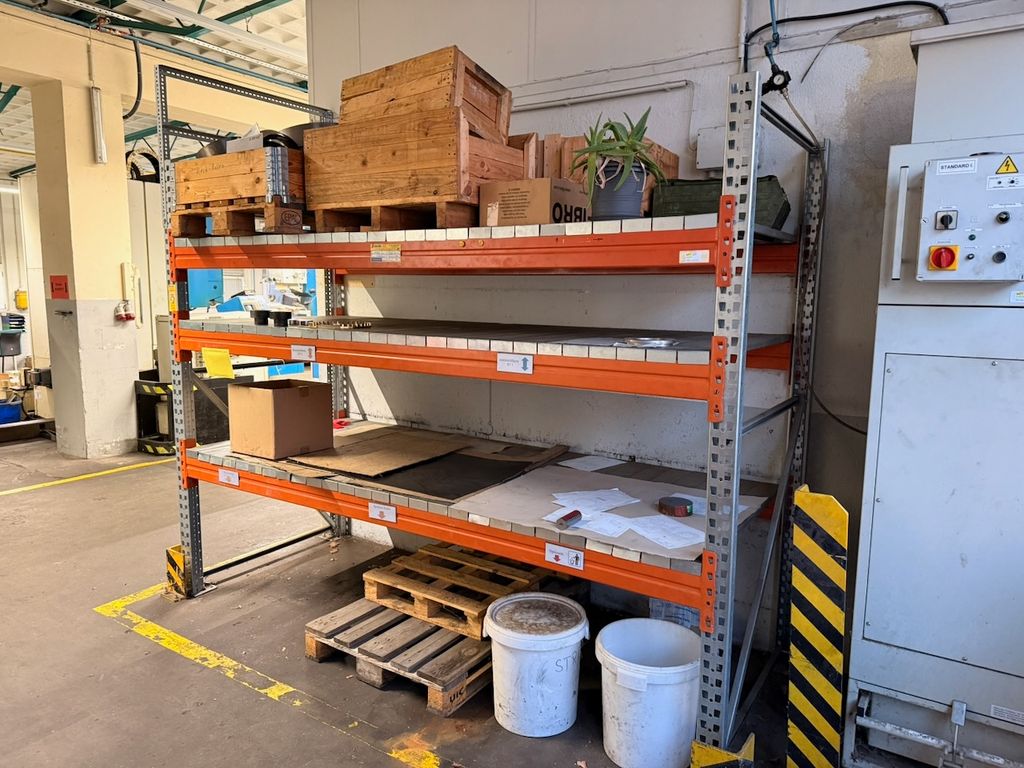 Industrie-Schwerlastregal aus Stahl, bestehend aus Ständerrahmen, Traversen und Stahlauflagen. Ausgelegt für hohe Fach- und Feldlasten. Geeignet für Lager, Werkstatt oder Industrieeinsatz. Regalsystem wurde im laufenden Betrieb genutzt und regelmäßig geprüft. Verkauf erfolgt ohne Inhalt.
