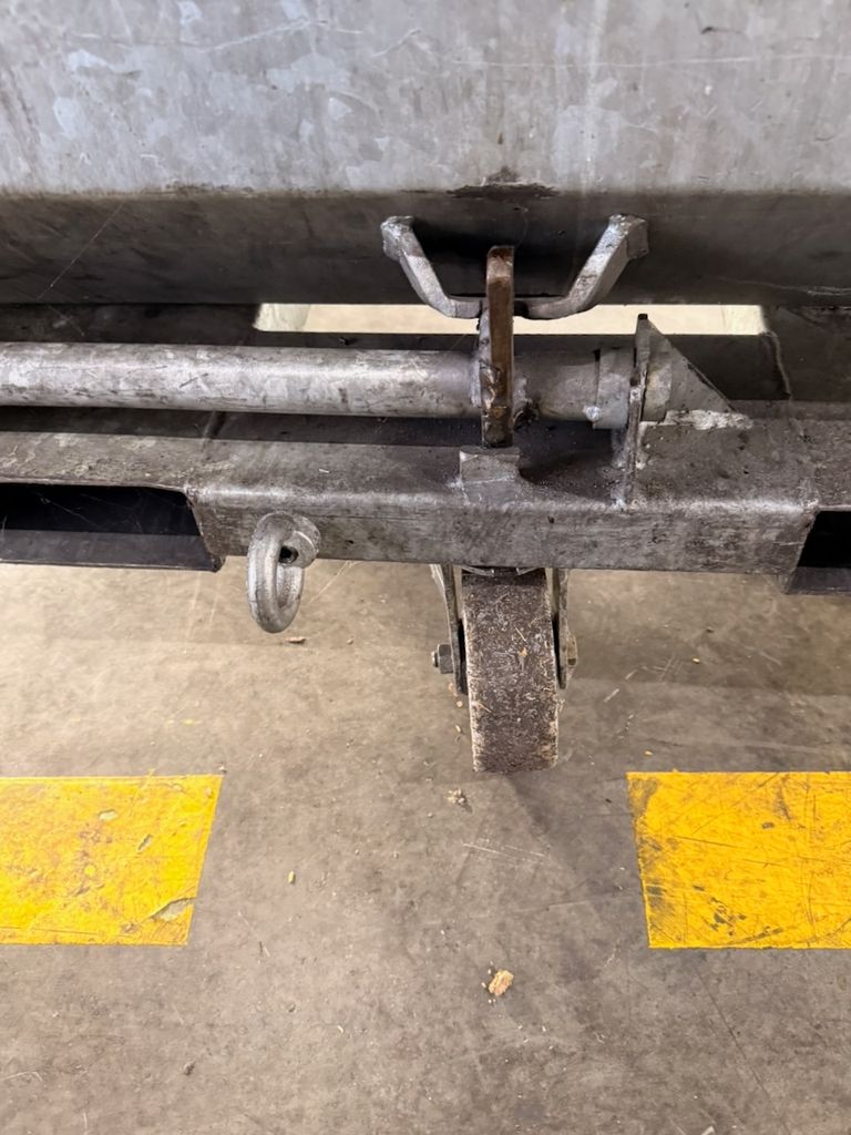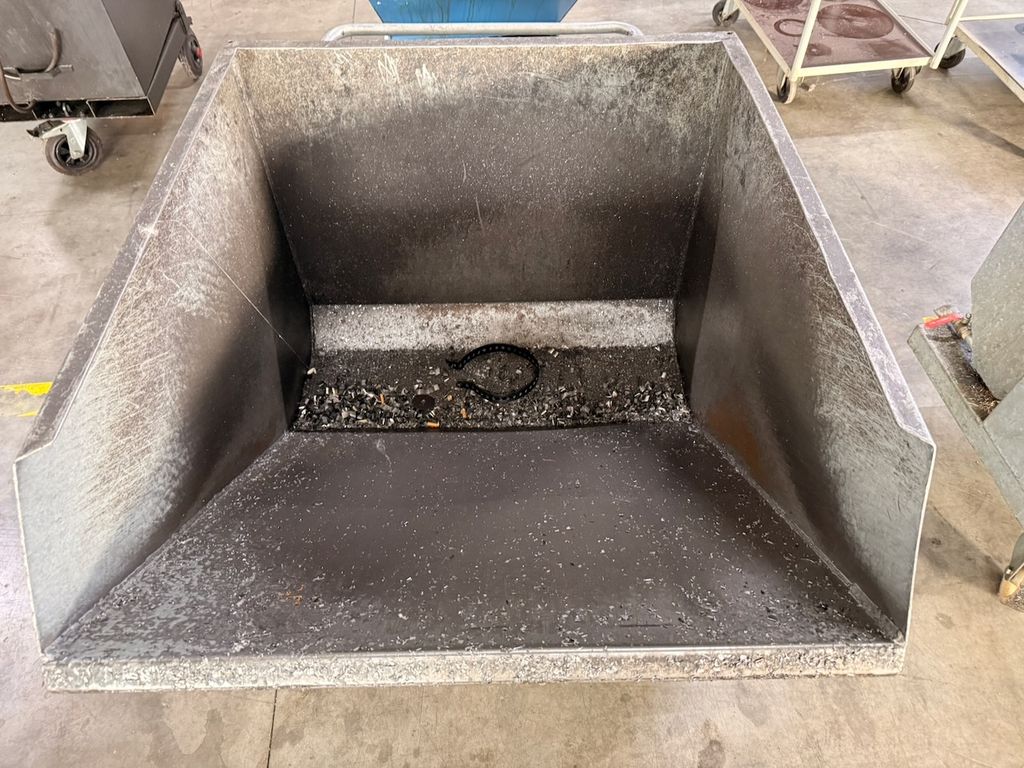 Gebrauchter Kippbehälter aus verzinktem Stahl, geeignet für Späne, Schrott und sonstige Schüttgüter.