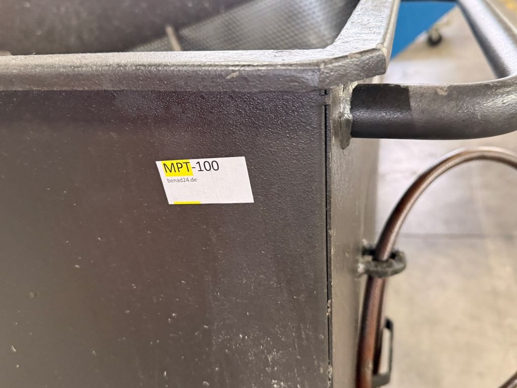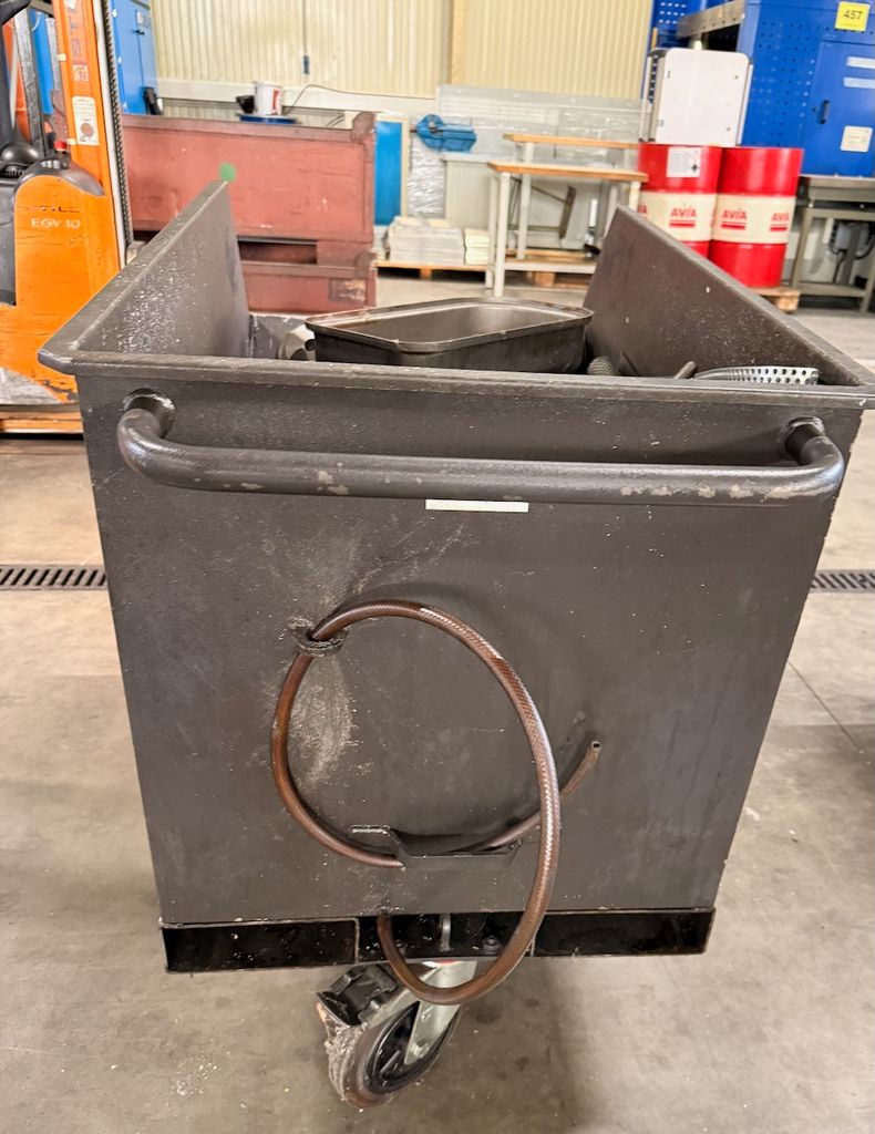 Der Behälter ist rollbar (3 Räder), verfügt über eine Kippvorrichtung und ist voll funktionsfähig. Optische Gebrauchsspuren durch zuvor industrielle Nutzung vorhanden. Maße: ca. 112 × 64 × 92 cm (L×T×H).