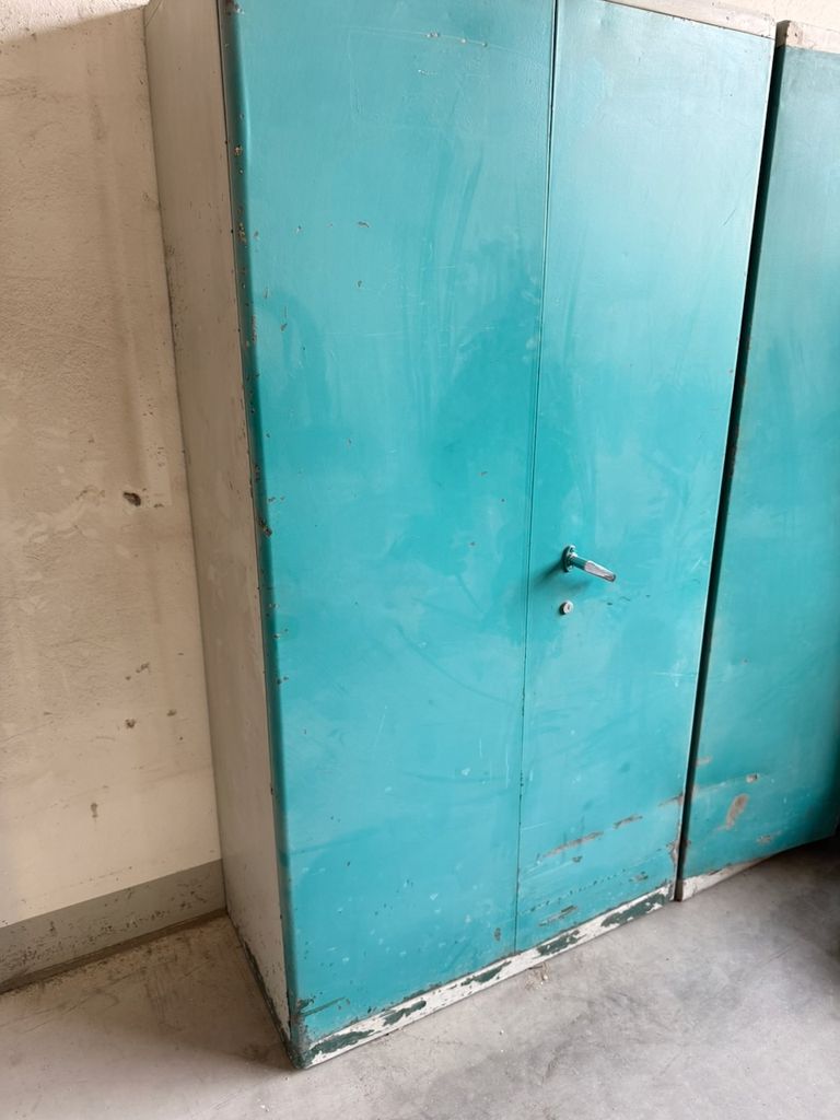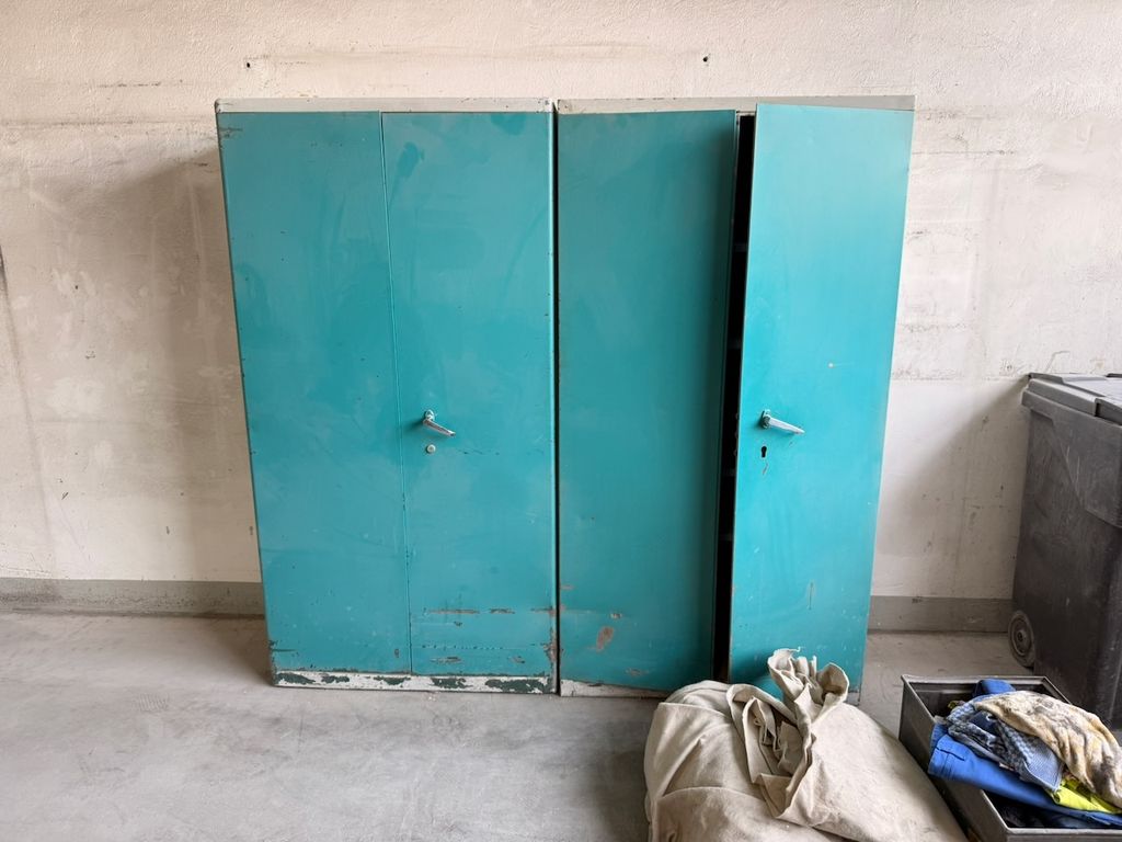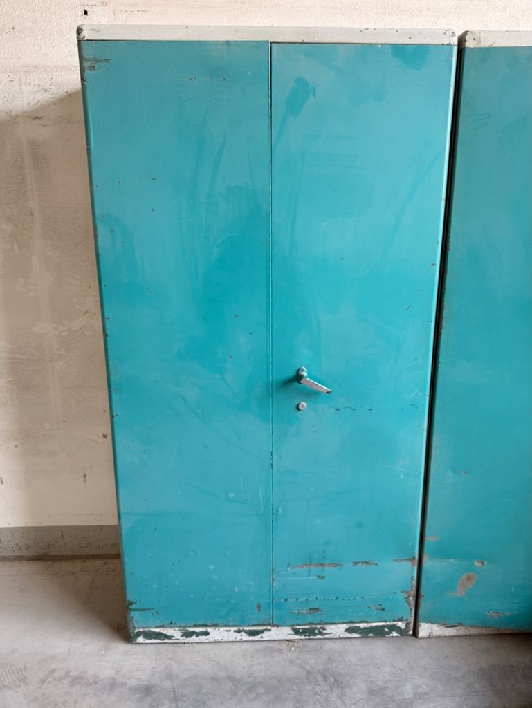 2 Stück stabile Stahlschränke in klassischer Werkstattausführung.