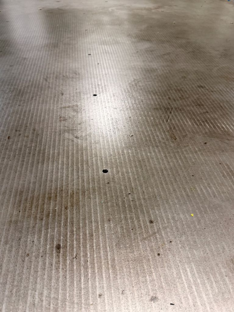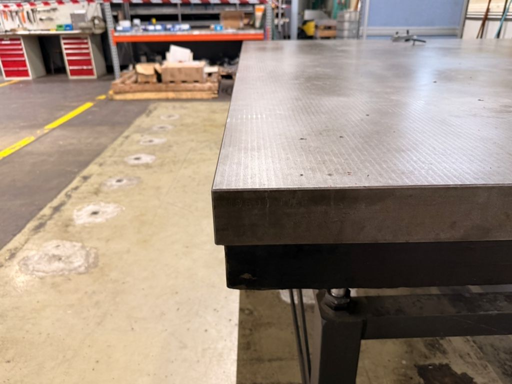 Gebrauchte massive Guss-Messplatte mit geriffelter Oberfläche. Auf stabilem verschweißtem Stahl-Untergestell montiert. Typische Nutzungsspuren vorhanden. Oberfläche mit vereinzelten Punktbohrungen, keine sichtbaren tiefen Beschädigungen oder Risse.