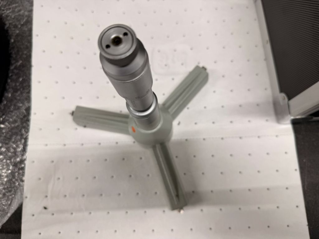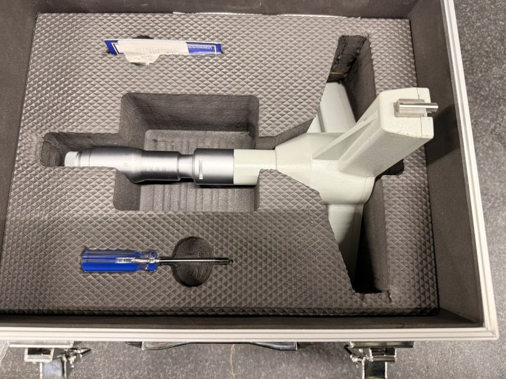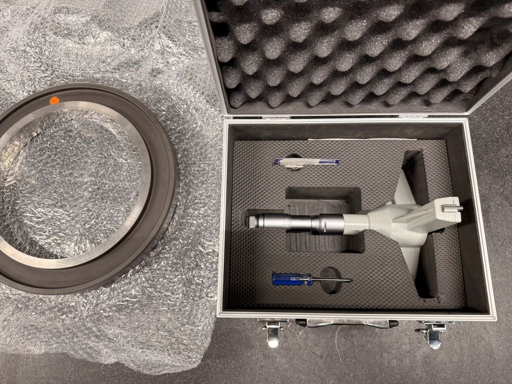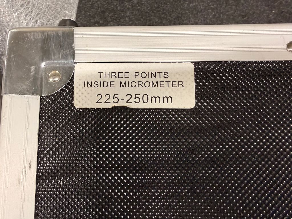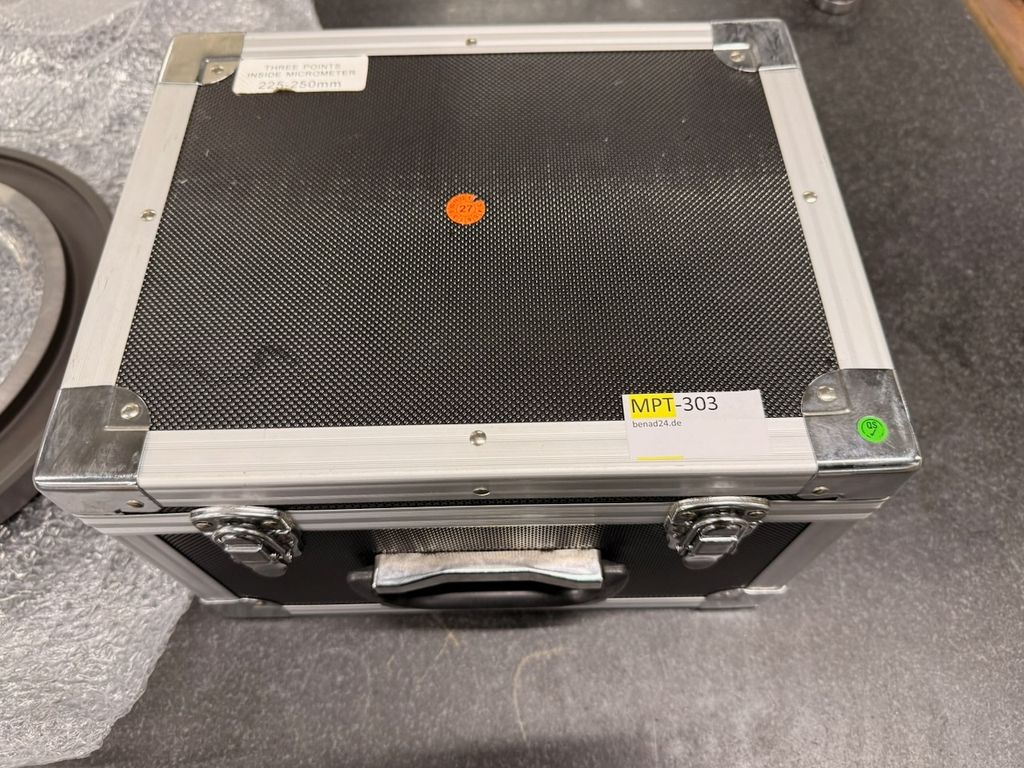 3-Punkt-Innenmessschraube für den Messbereich 225–250 mm inklusive passendem Einstellring Ø 250 mm. Das Messgerät befindet sich im Originalkoffer mit Schaumstoffeinlage. Eine Bedienungsanleitung für Dreipunkt-Innenmessschrauben (analog/digital) liegt bei.