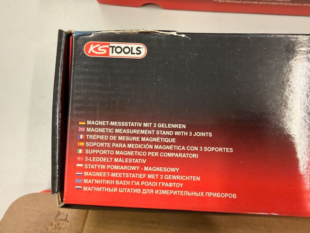Neues, unbenutztes Magnet-Messstativ von KS TOOLS zur Aufnahme von Messuhren / Messuhraufnahmen. Ausführung mit 3 präzisen Gelenken für flexible Positionierung und stabile Fixierung bei Mess- und Prüfarbeiten.