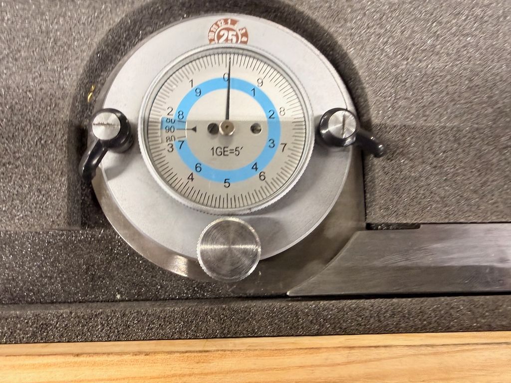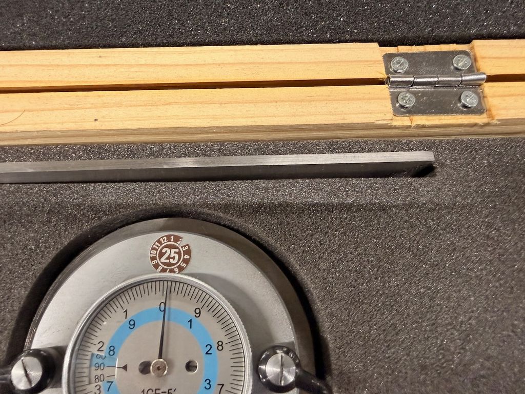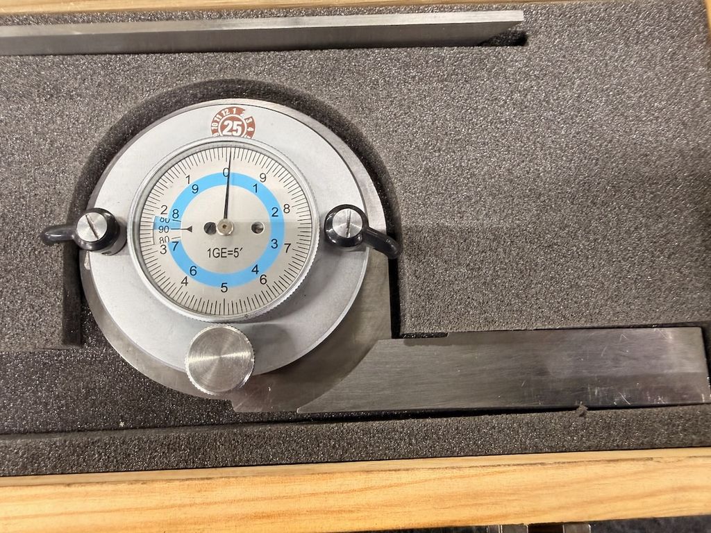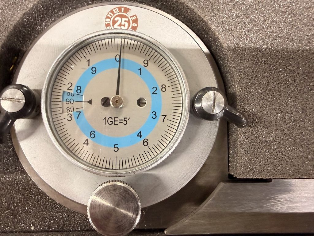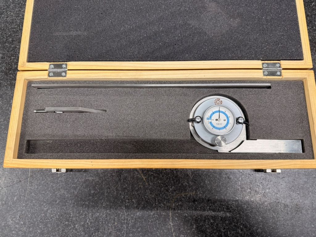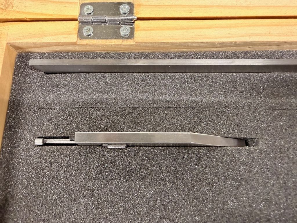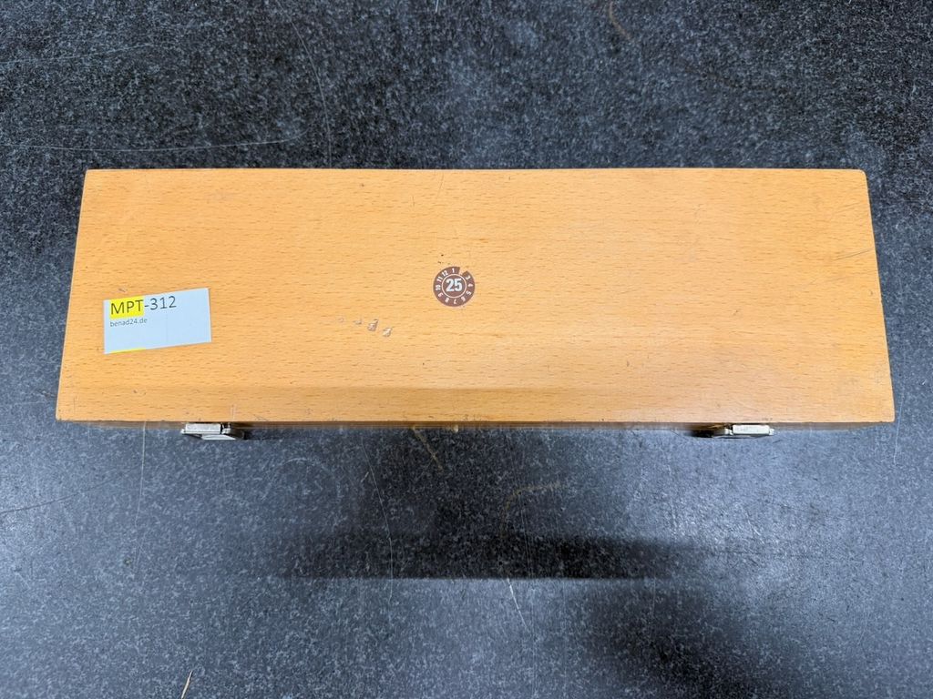 Gebraucht. Optisch guter Zustand mit leichten Gebrauchsspuren an Kasten und Messflächen. Messuhr mechanisch intakt, Zeiger bewegt sich frei.