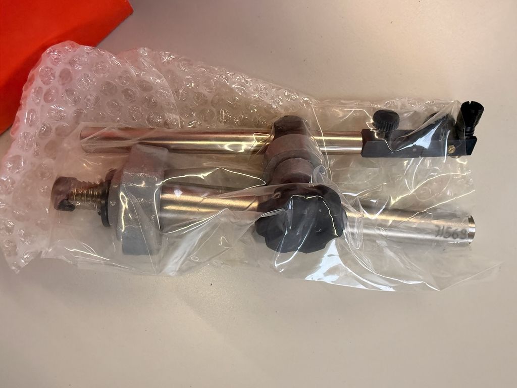 Robuste Ausführung mit verstellbarem Haltearm und Feineinstellung für präzise Messaufbauten in Werkstatt und Qualitätssicherung.