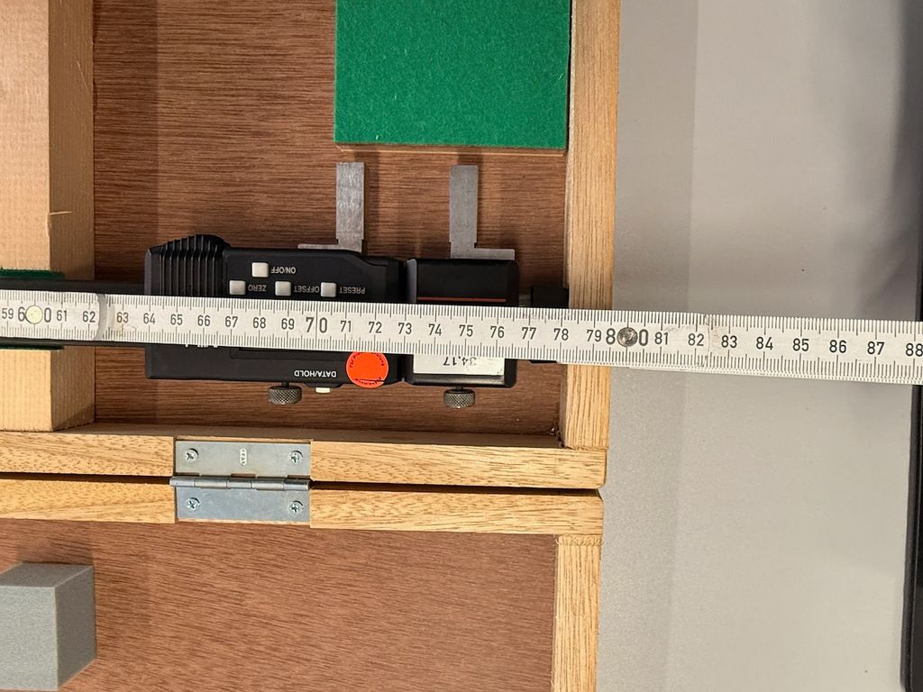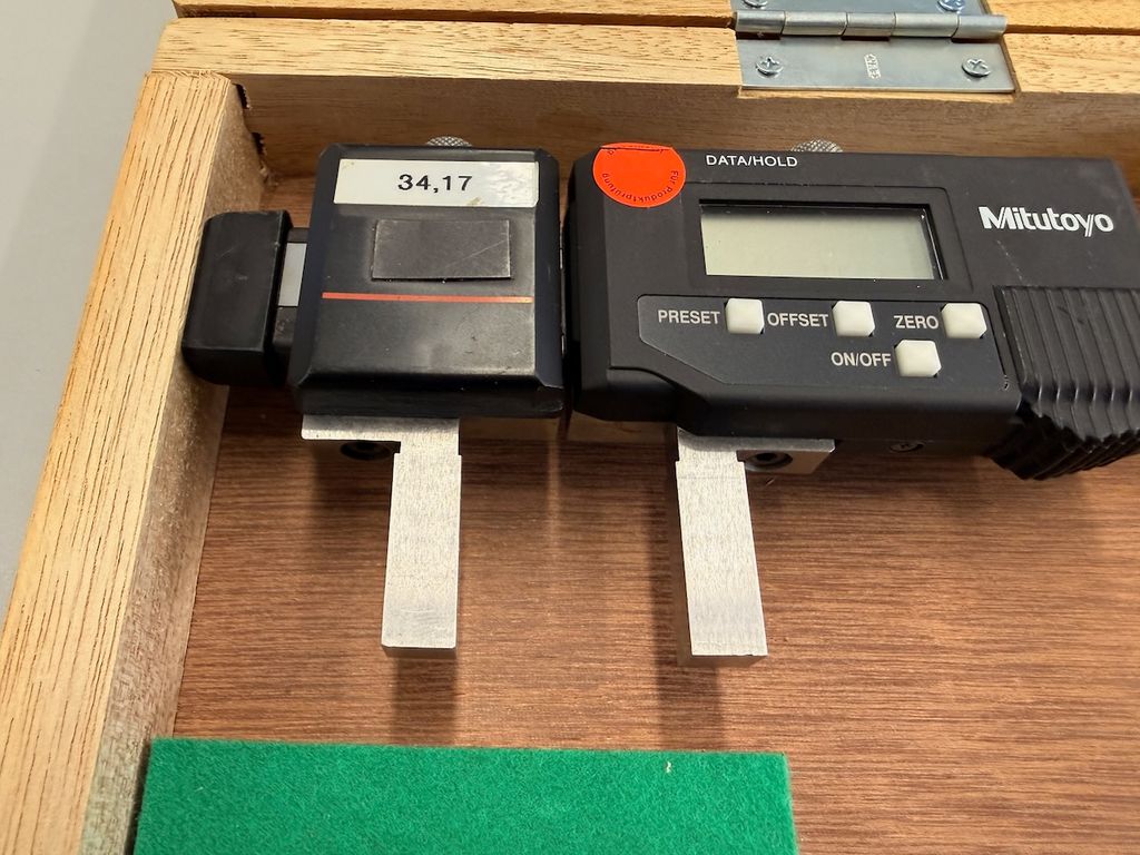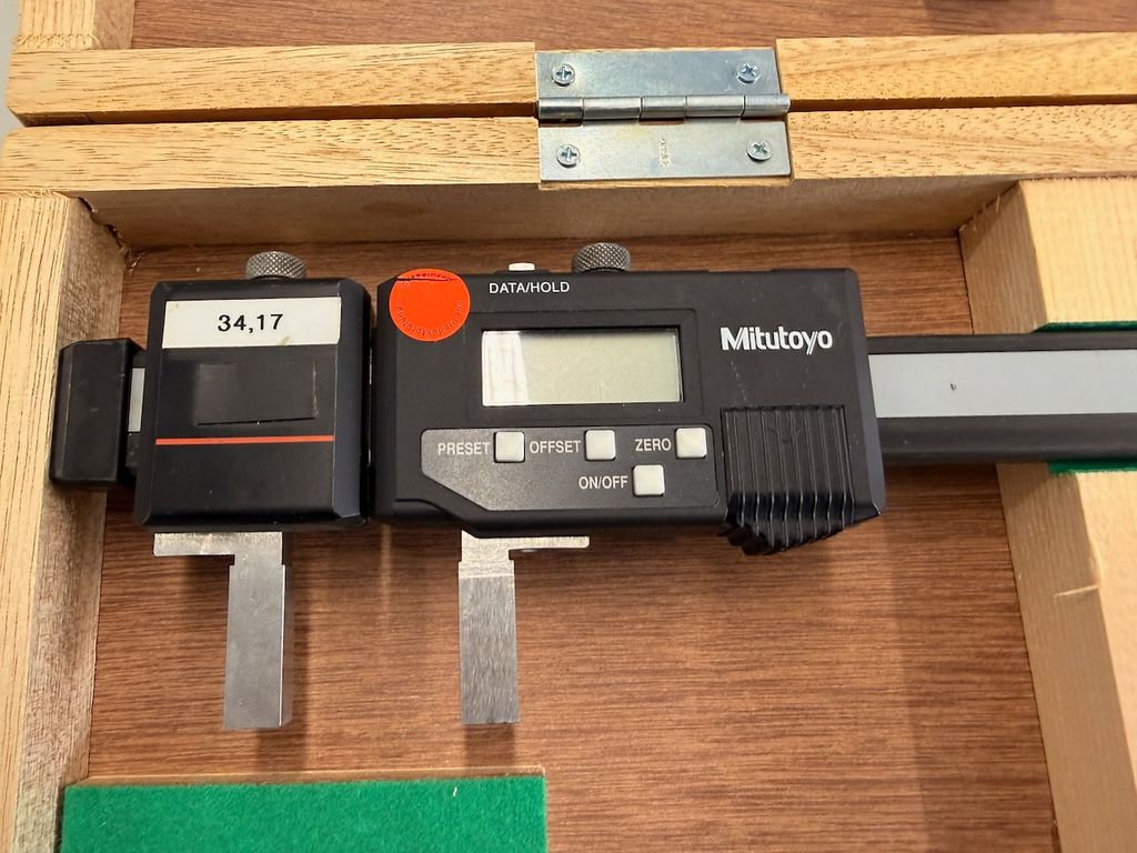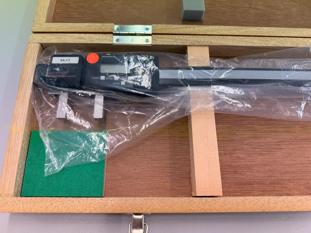 Das Messgerät verfügt über eine digitale Anzeigeeinheit mit Datenausgang. Seriennummer laut Typenschild: 0002C49. Das Gerät wird im originalen Mitutoyo-Holzkasten geliefert.