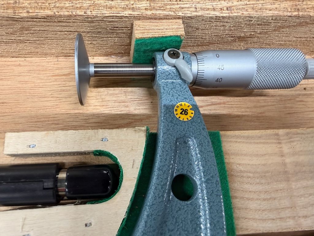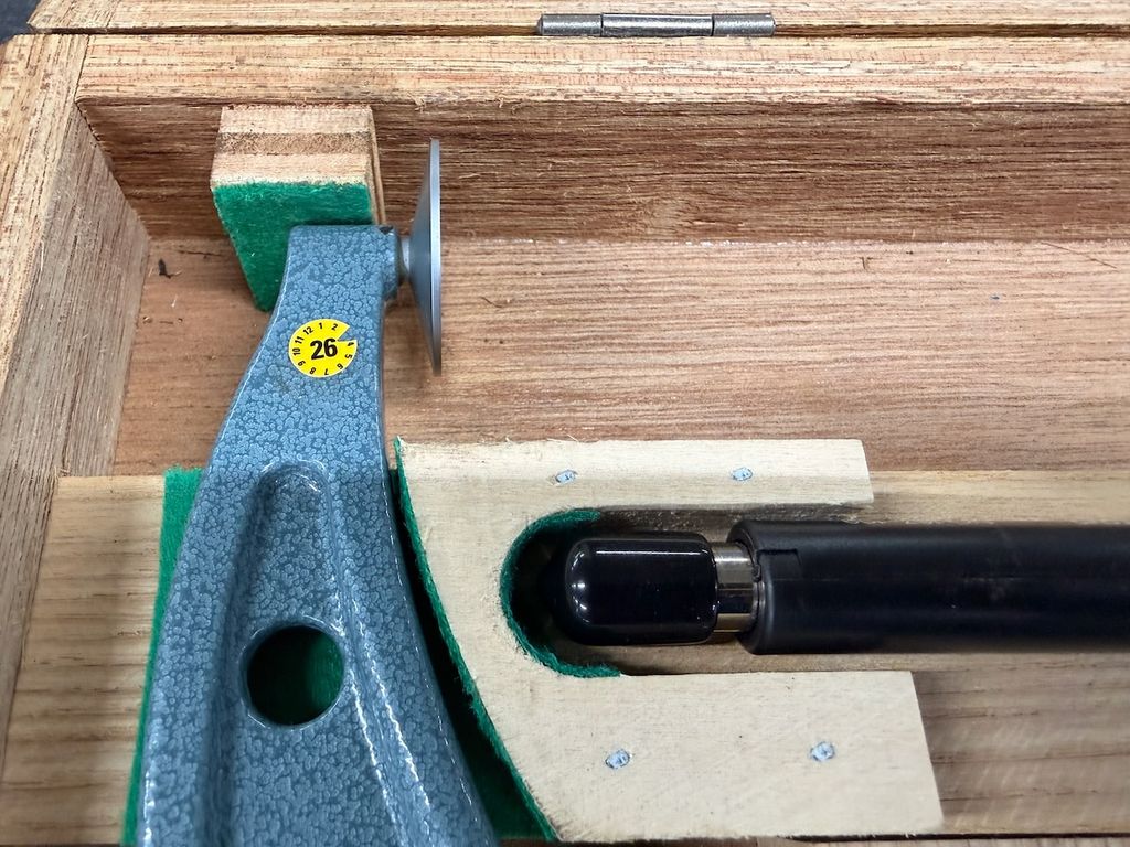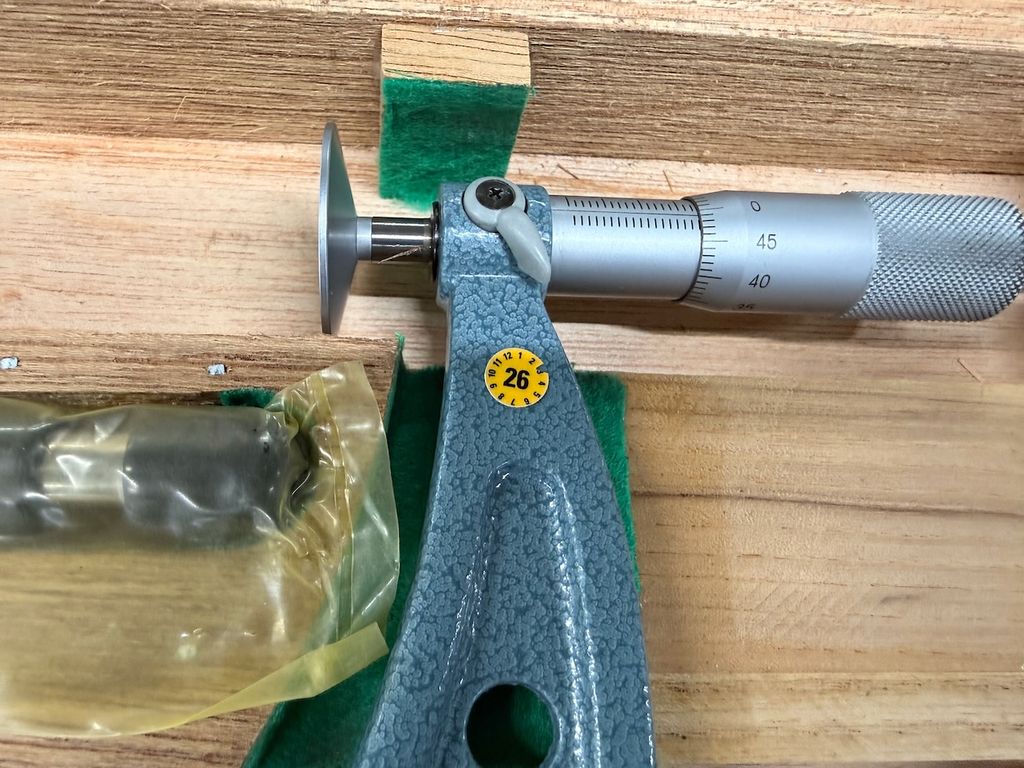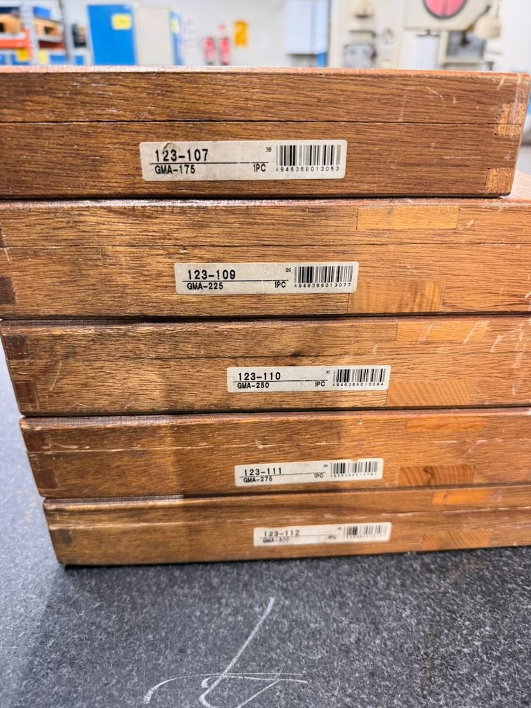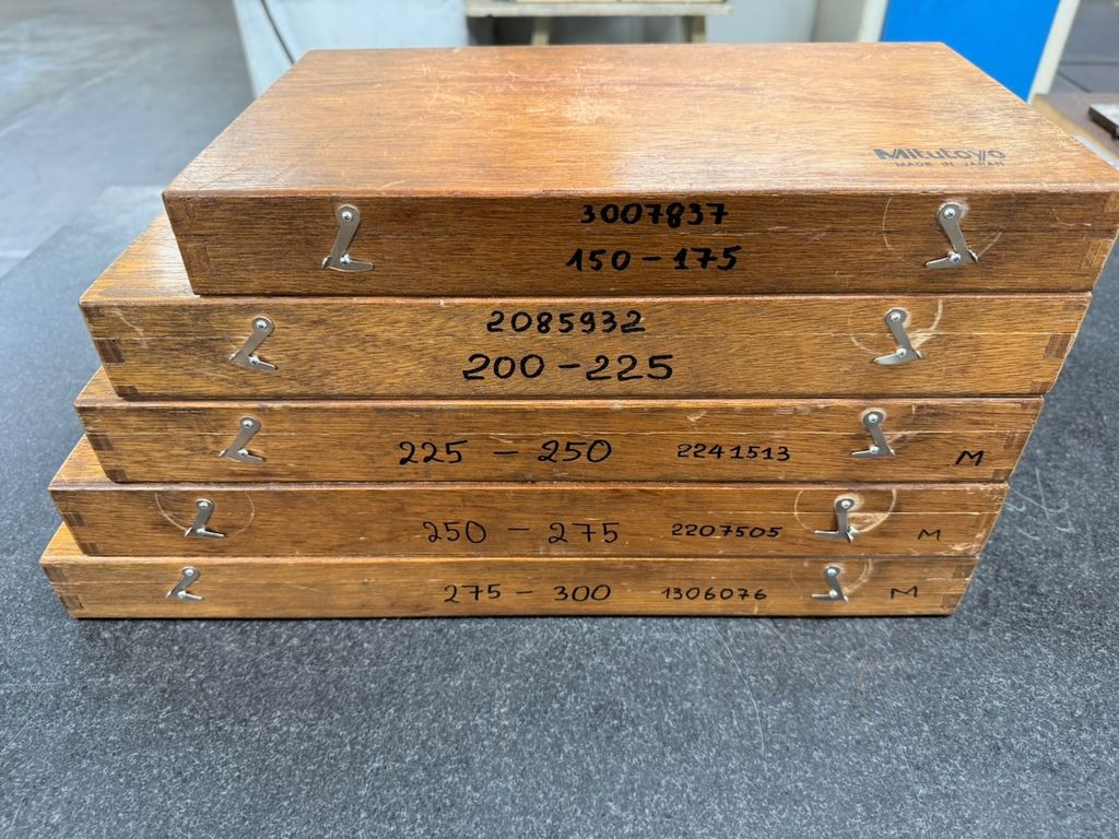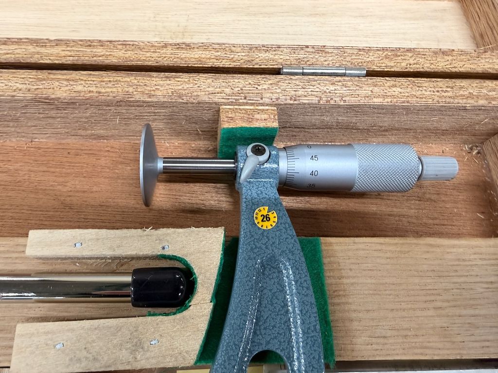 Posten aus 5 Mitutoyo Teller-Messköpfen in unterschiedlichen Messbereichen. Die Messgeräte befinden sich jeweils in originalen Holzkästen. Teller-Messflächen sind vorhanden, Spindeln und Skalen gut ablesbar. Teilweise liegen japanische Unterlagen bei.