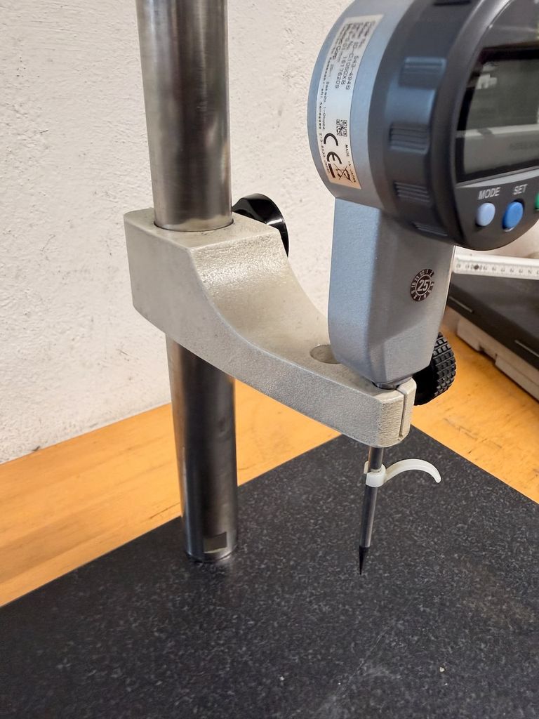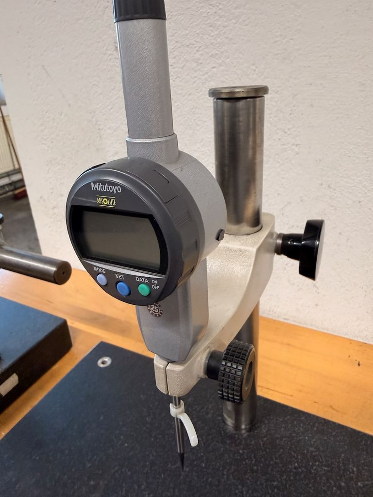 Digitale Messuhr von Mitutoyo mit Messstativ und Granitmessplatte.