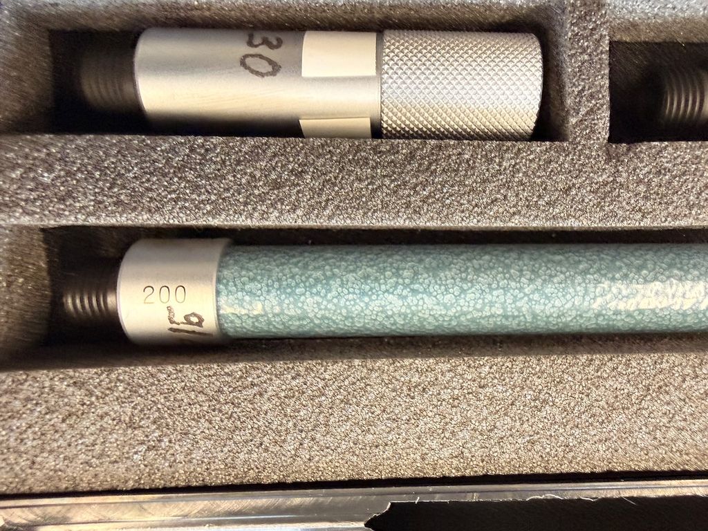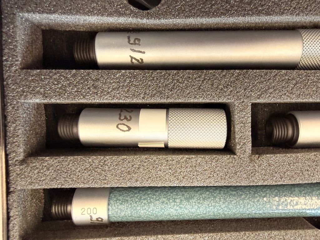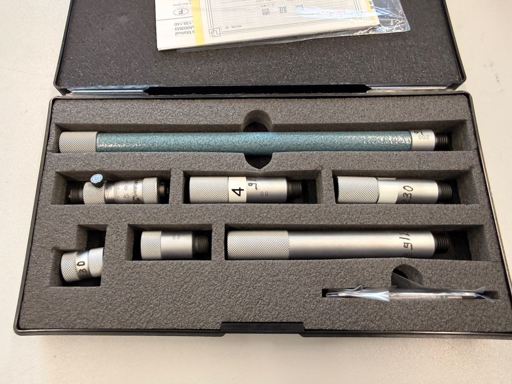 Innenmikrometer-Set des Herstellers Mitutoyo, Typ IMZ-500. Das Set dient zur präzisen Innenmessung von Bohrungen und Nuten und ist modular mit mehreren Verlängerungen aufgebaut.