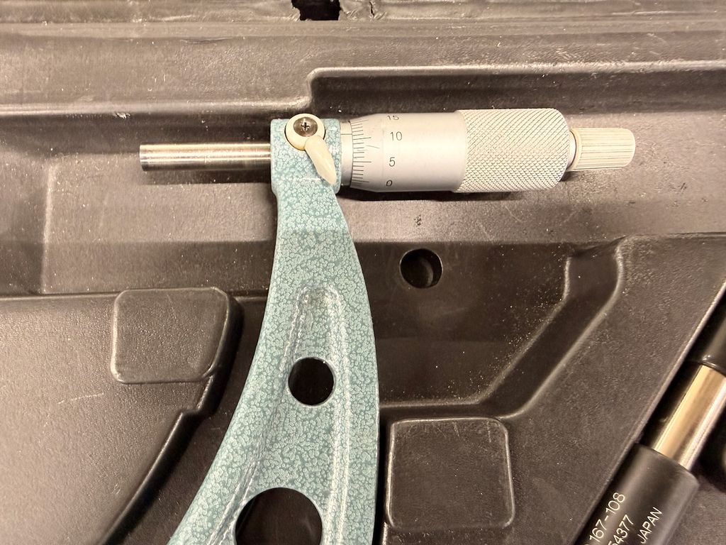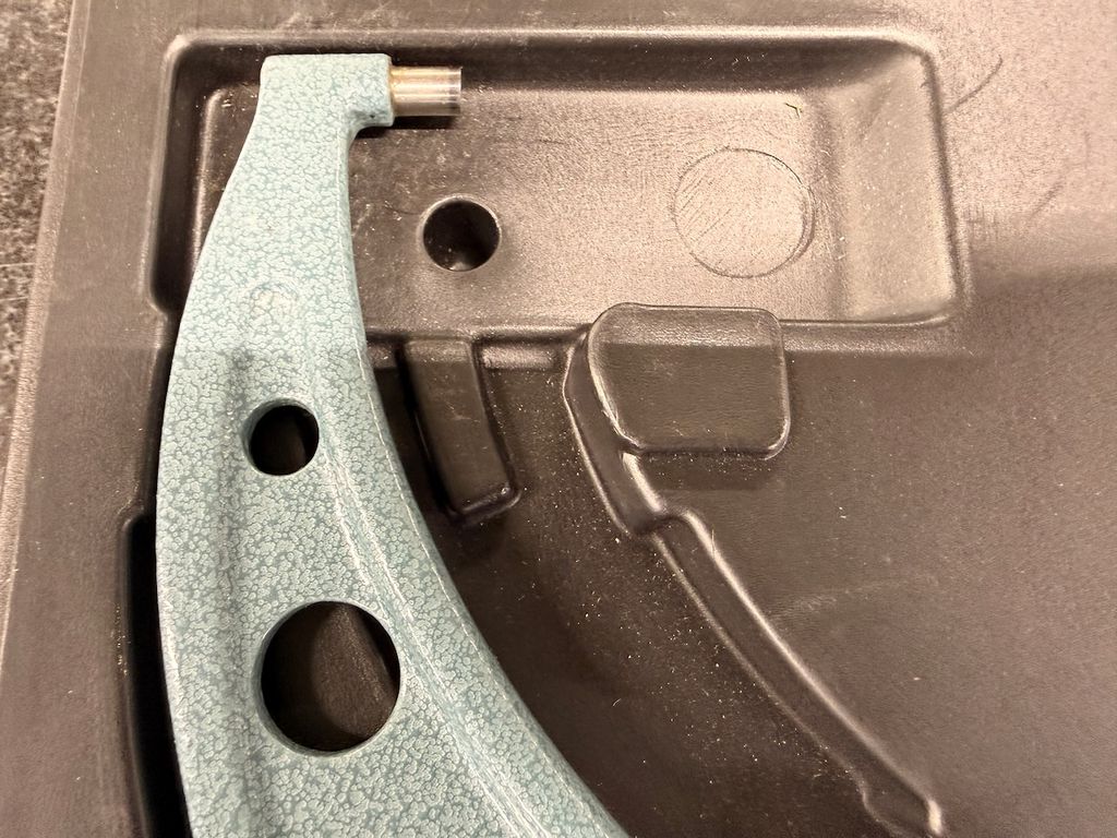 Zum Verkauf steht eine Mitutoyo Außenmikrometerschraube für den Messbereich 200–225 mm. Das Messgerät befindet sich im originalen Kunststoffkoffer und wird inklusive Einstellmaß geliefert. Skala und Trommel sind gut ablesbar, die Spindel läuft sauber.