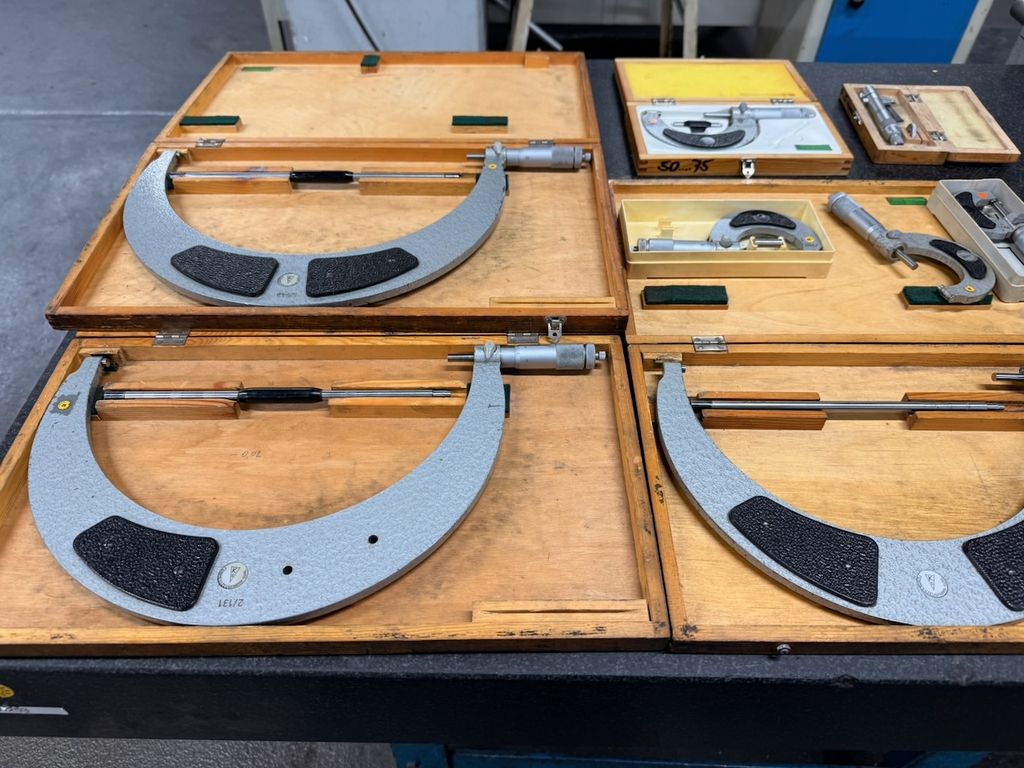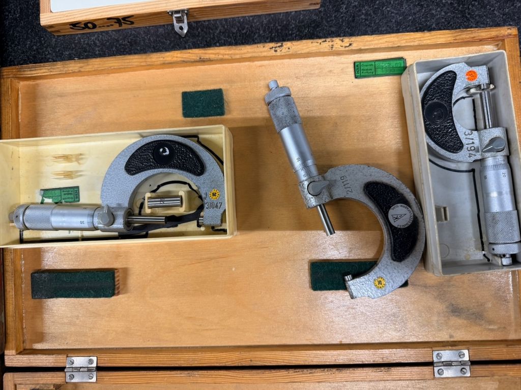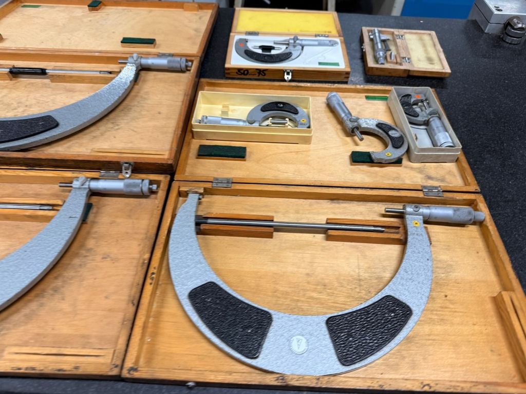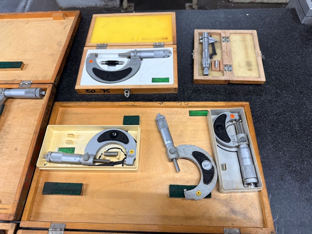 Posten aus 8 Bügelmessschrauben (Außenmikrometer) in verschiedenen Messbereichen. Die Messgeräte stammen aus industriellem Umfeld und werden überwiegend in passgenauen Holzkästen geliefert.