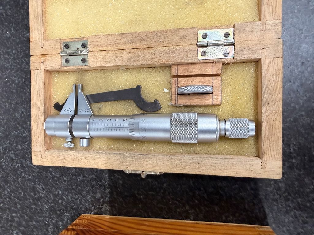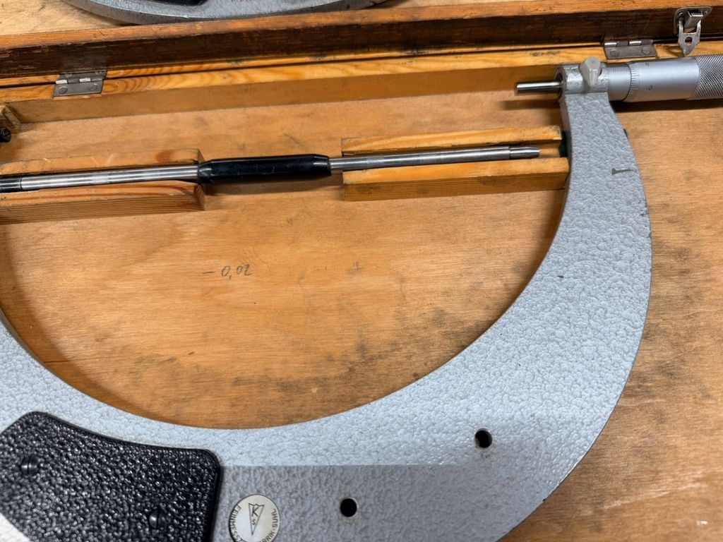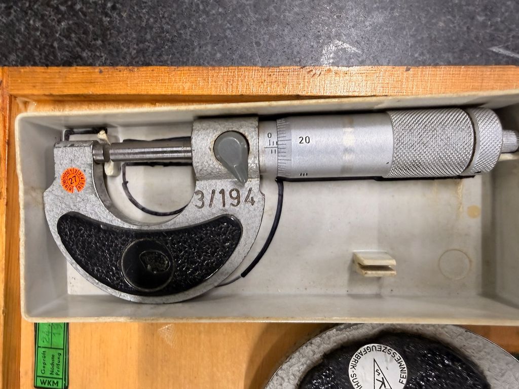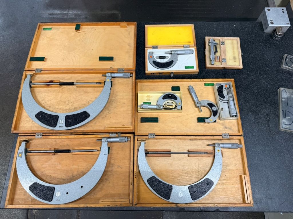 Posten aus 8 Bügelmessschrauben (Außenmikrometer) in verschiedenen Messbereichen. Die Messgeräte stammen aus industriellem Umfeld und werden überwiegend in passgenauen Holzkästen geliefert.