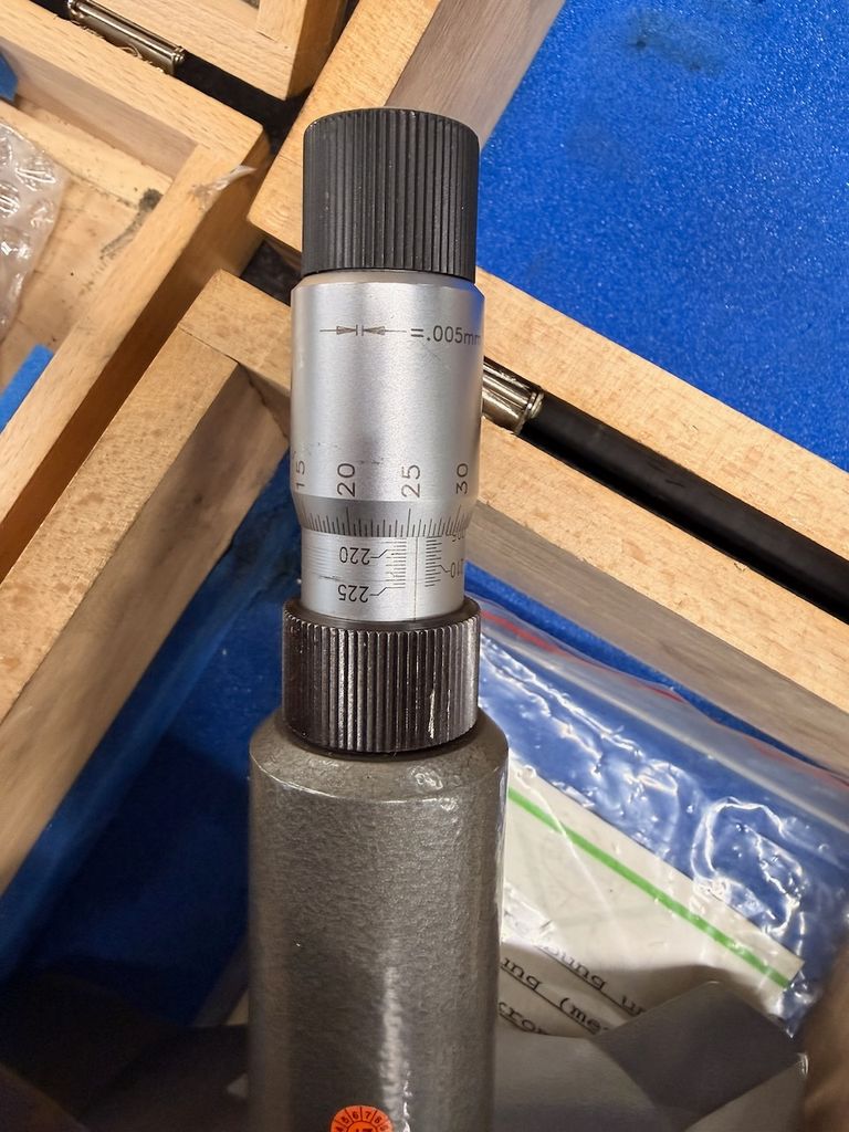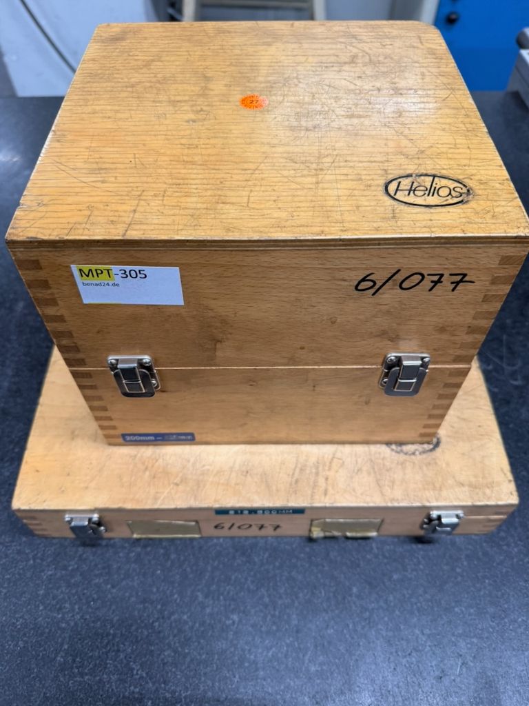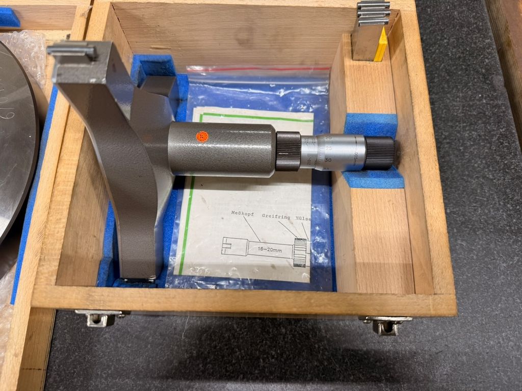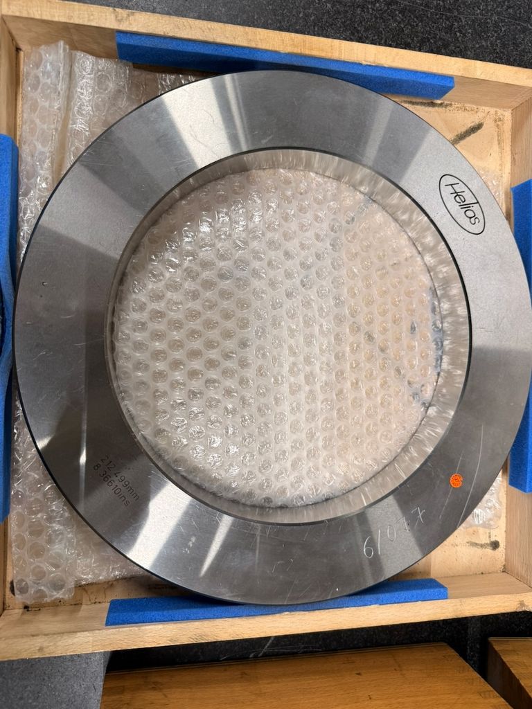 Helios 3-Punkt-Innenmessgerät für den Messbereich 200–225 mm inklusive passendem Einstellring Ø 212,499 mm. Das Messgerät wird im originalen Holzkasten geliefert. Für den Einstellring liegt eine Maßüberprüfung vor (Sollmaß 212,499 mm / Istmaß 212,497 mm, Datum 29.01.2020). Prüfaufkleber vorhanden.