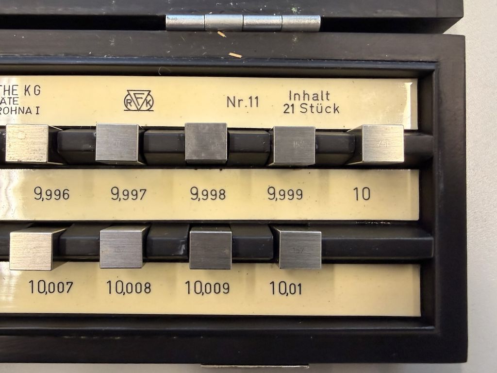 Feinstufen-Endmaßsatz zur Maßableitung und Feinjustage im Bereich um Nennmaß 10 mm.