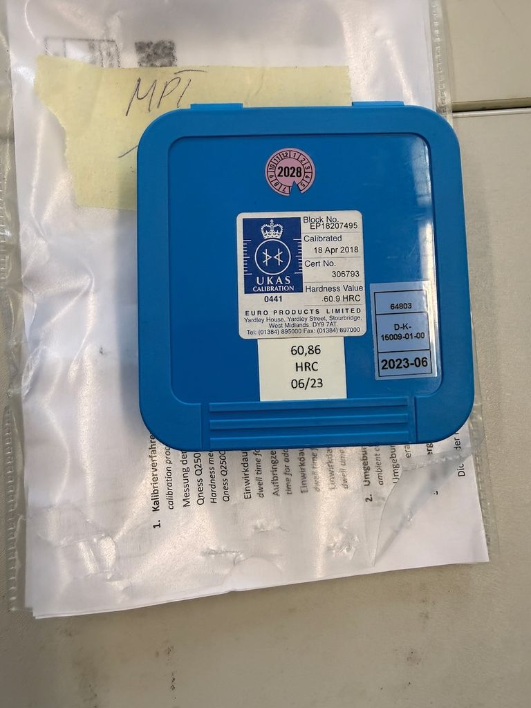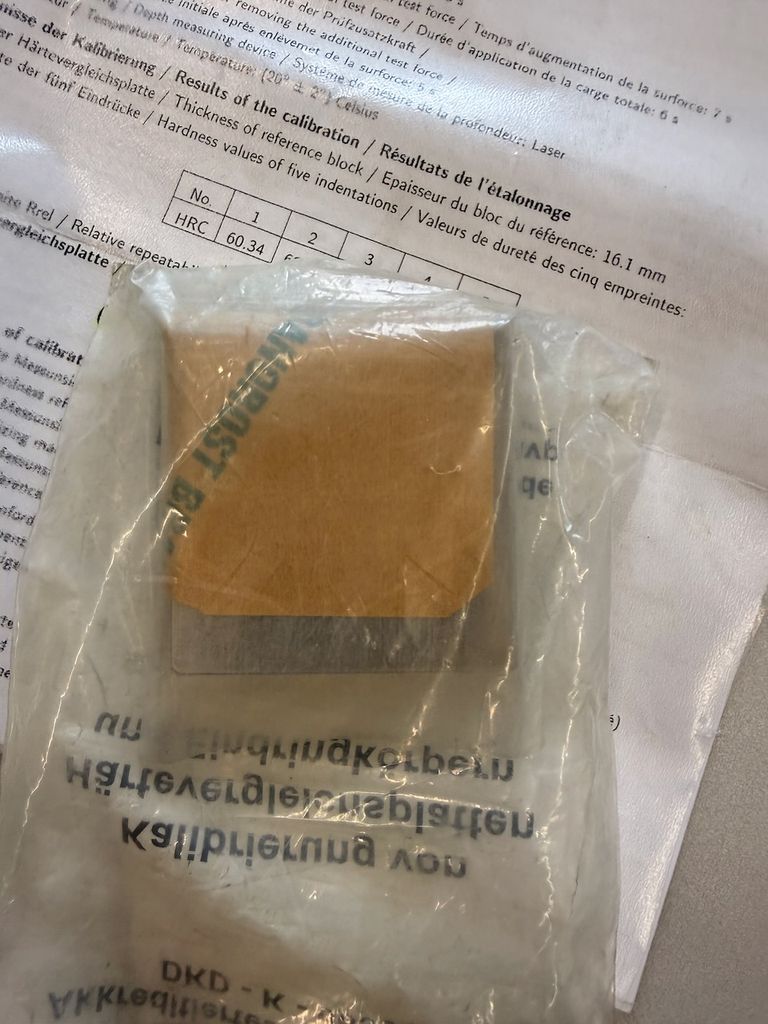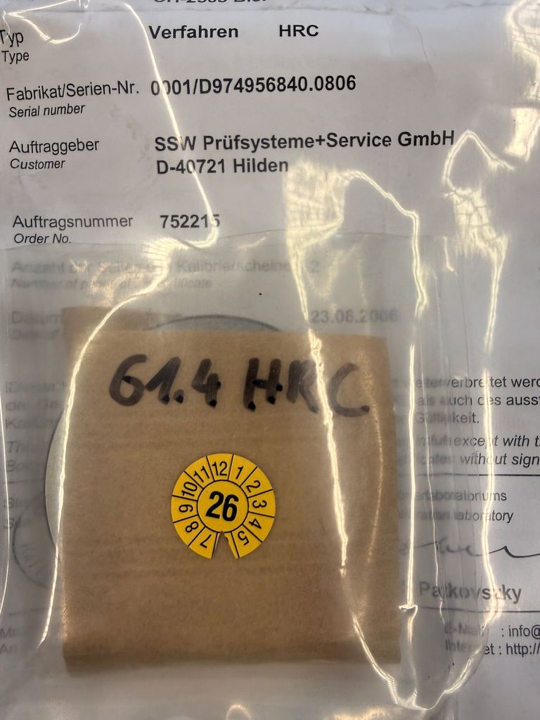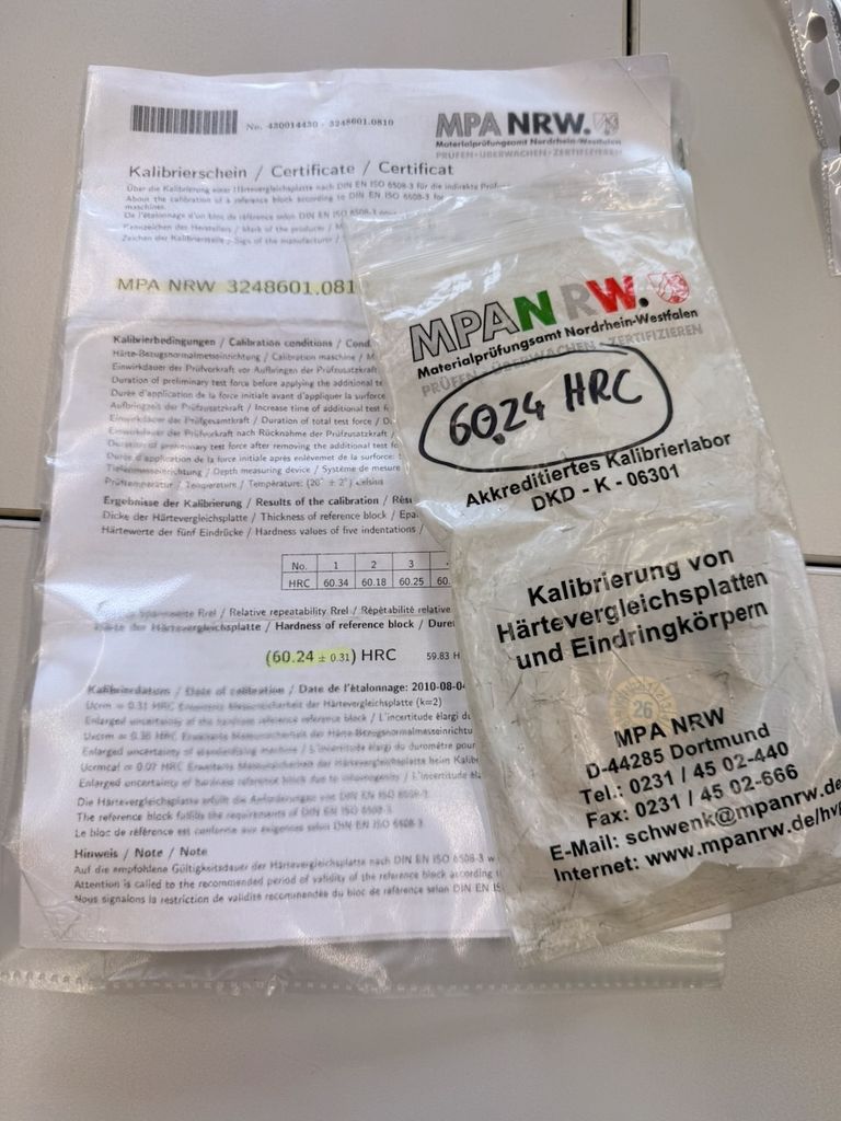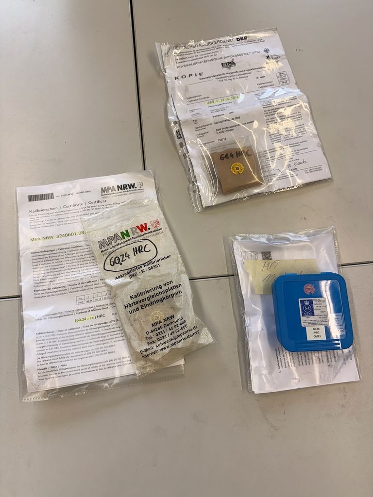 Härtevergleichsblöcke (HRC) zur Überprüfung, Einstellung und Kontrolle von Härteprüfgeräten (Rockwell C). Die Blöcke sind einzeln gekennzeichnet und befinden sich jeweils in Schutzverpackungen bzw. Etuis. Teilweise liegen Kalibrierscheine / Zertifikate bei (u. a. MPA NRW, DKD / UKAS).
