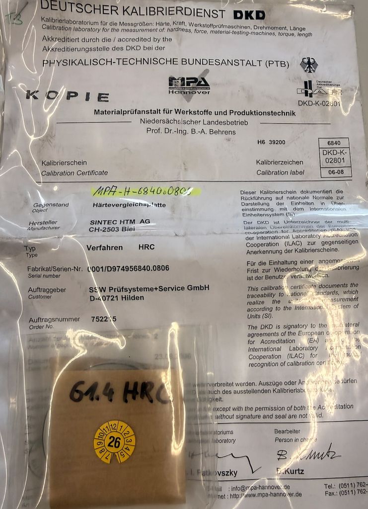 Zertifikate: vorhanden (MPA NRW / DKD / UKAS, siehe Unterlagen & Fotos)