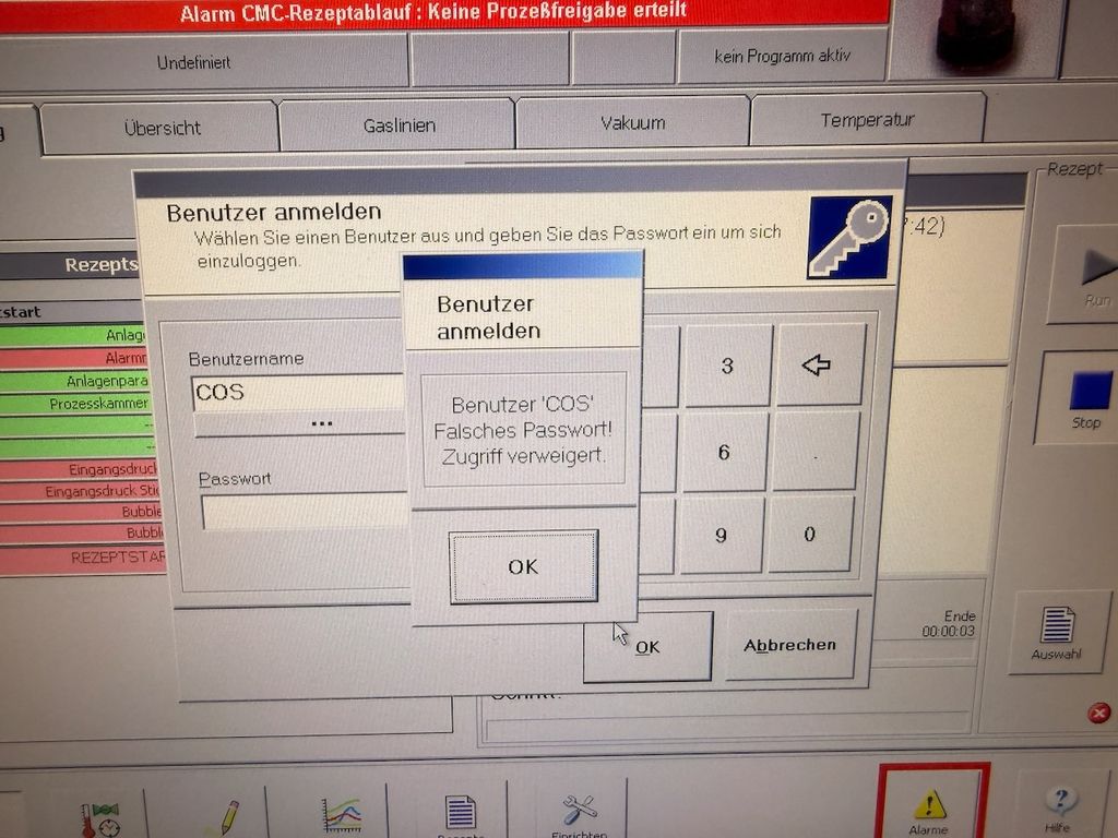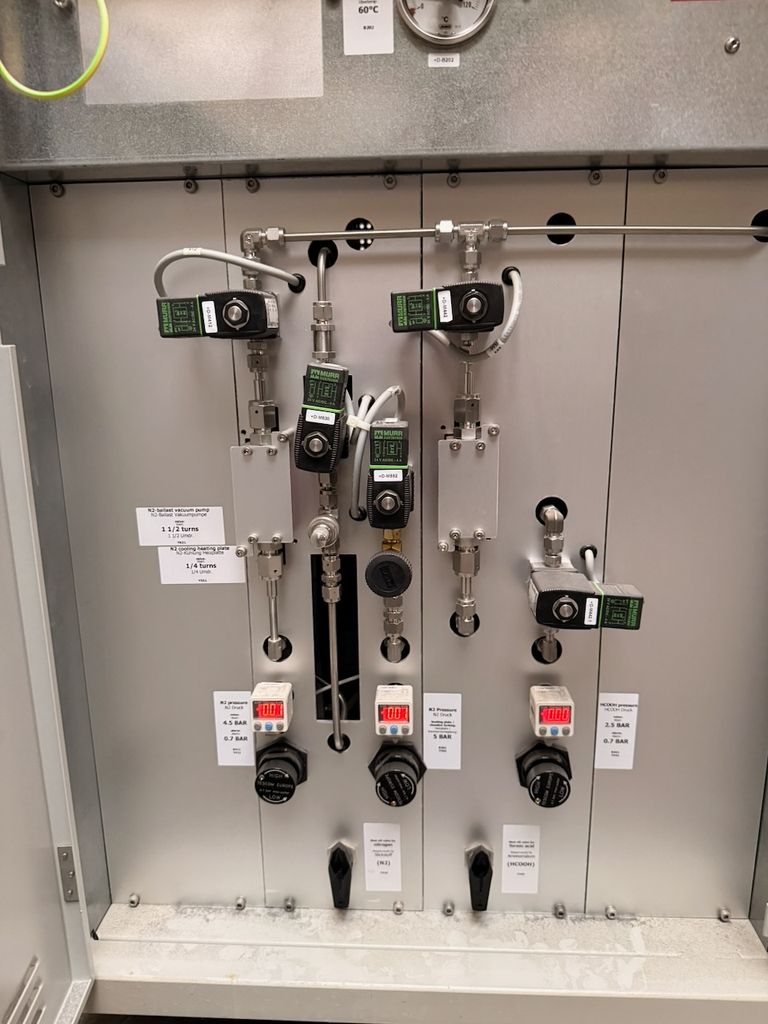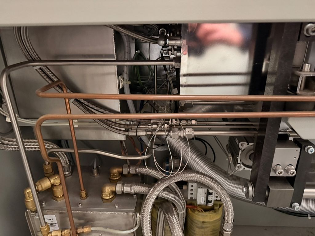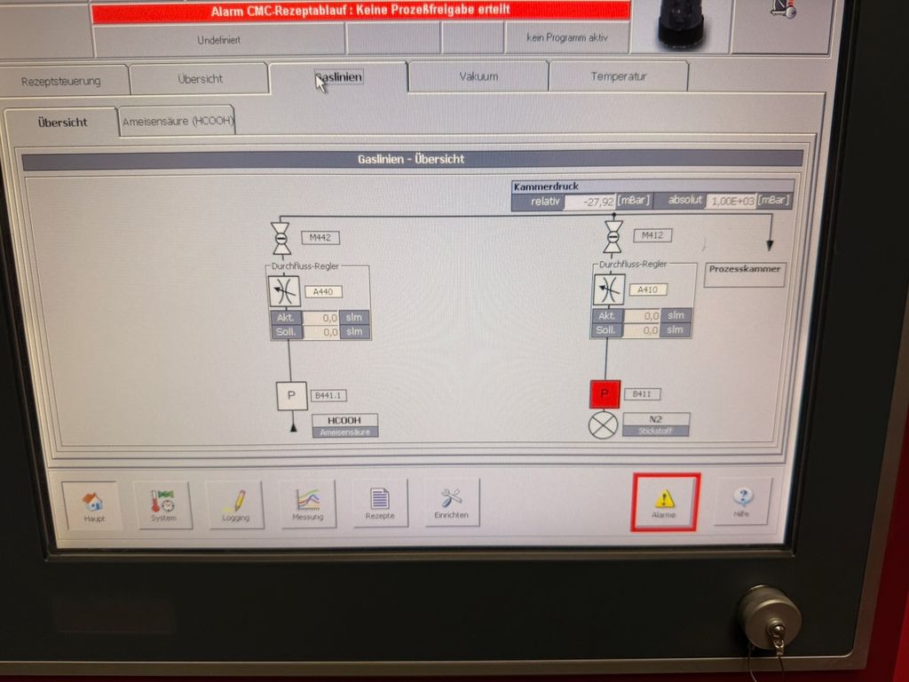 Thermische Prozessanlage mit Stickstoff- und Ameisensäureführung, inkl. Leybold Vakuumpumpe und Steuerung. Baujahr 2011. Gepflegter äußerer Zustand, jedoch ohne Dokumentation und ohne verfügbares Passwort – daher nur eingeschränkt getestet.