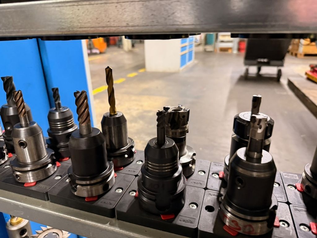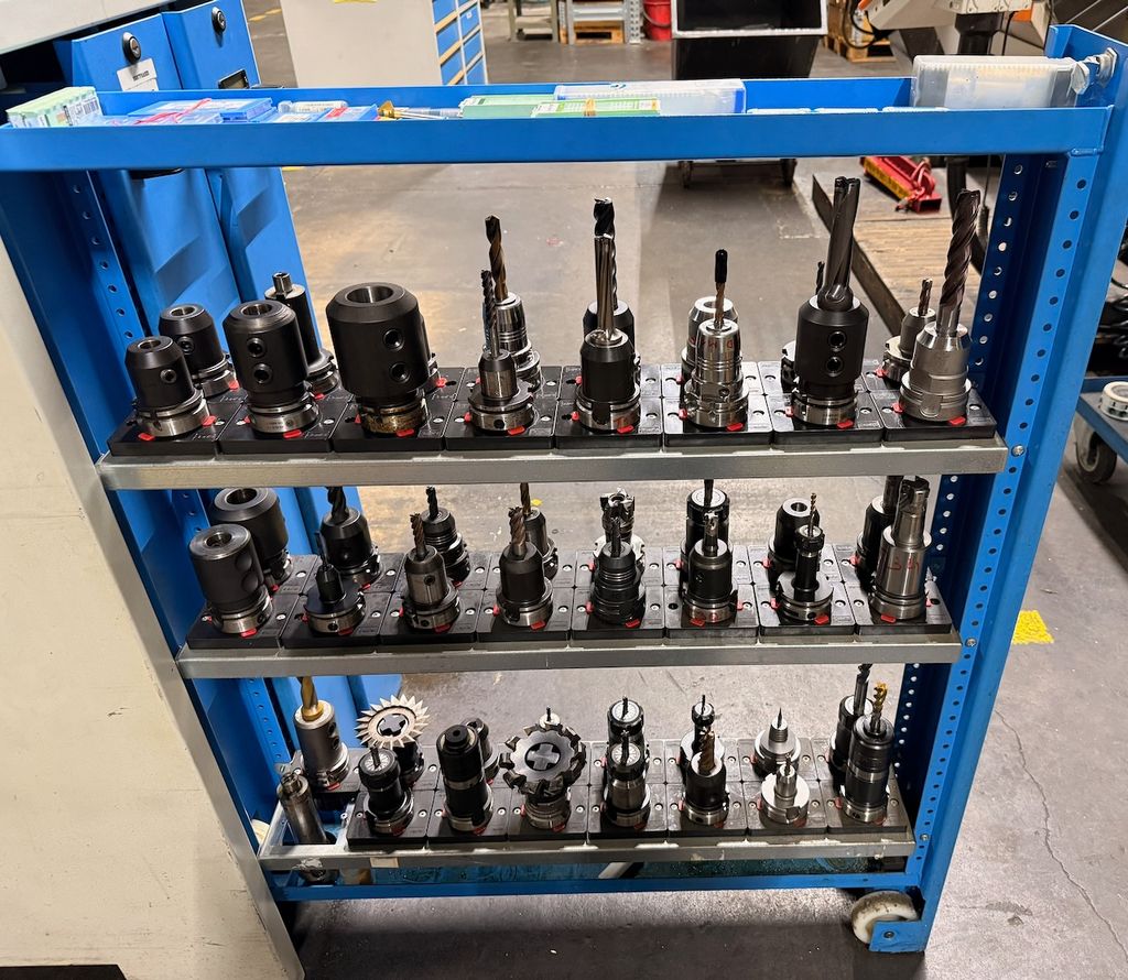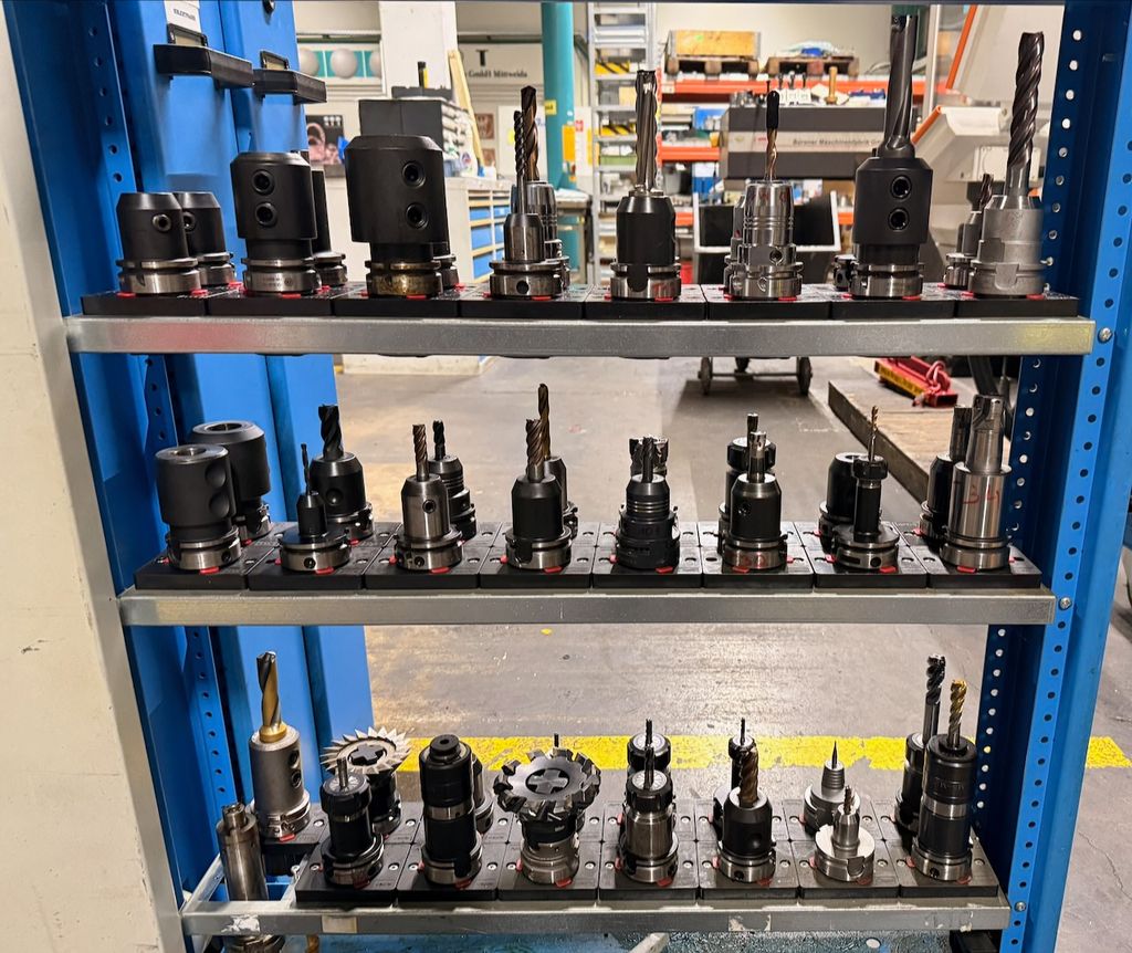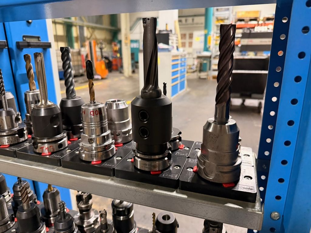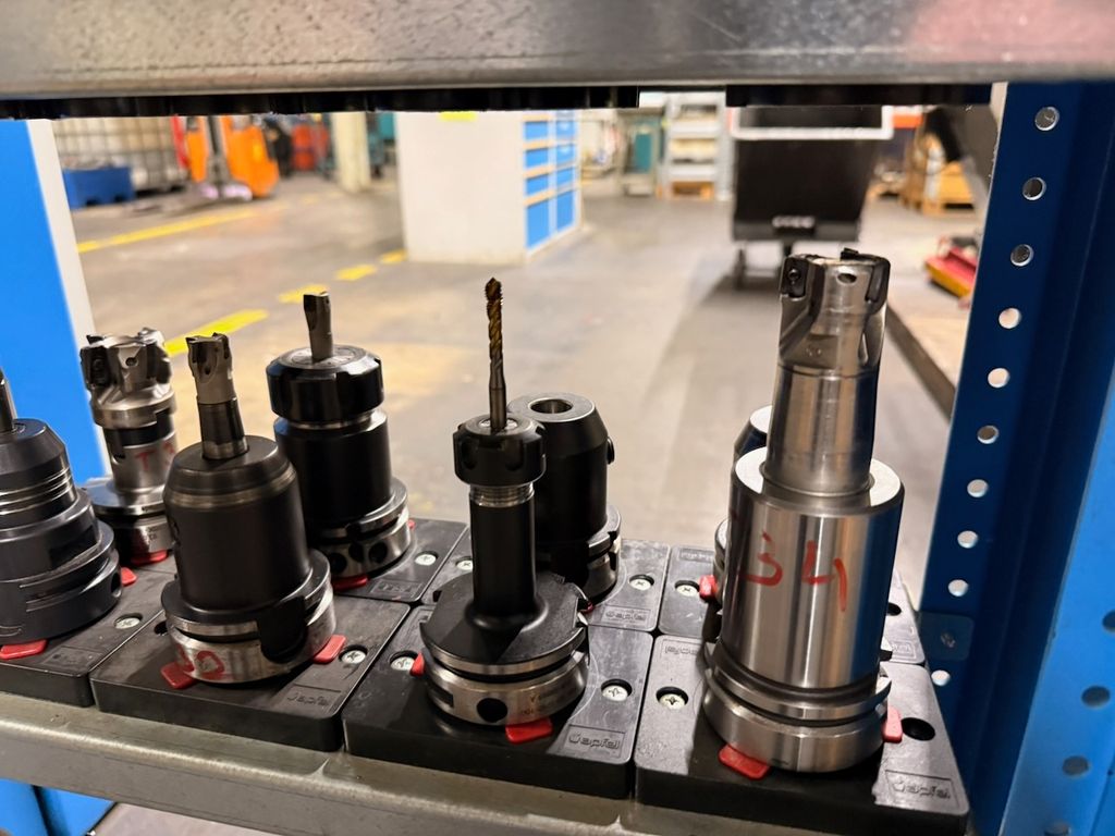 48× HSK-63 tool holders, mixed industrial stock: milling tool holders (Weldon), ER collet chucks, drill chucks, extensions, face mill/disc mill holders as well as various inserted cutters (solid carbide), drills, solid drills, etc. Tools partially mounted.