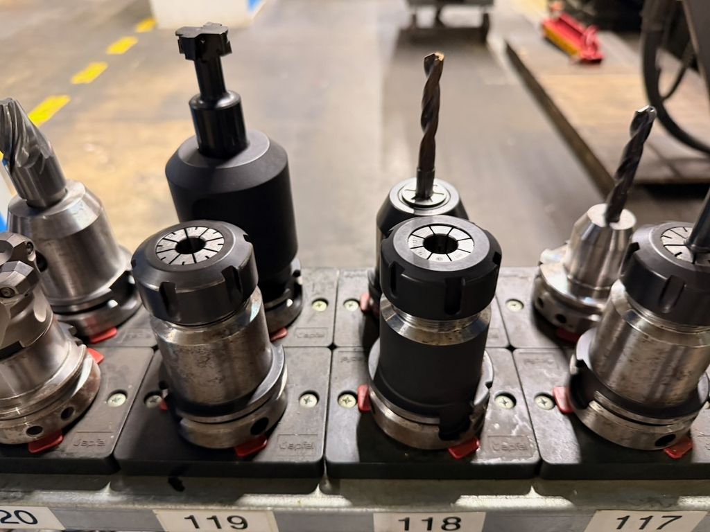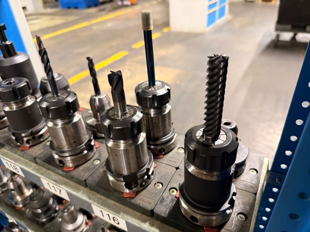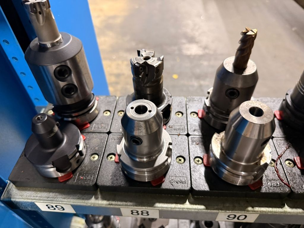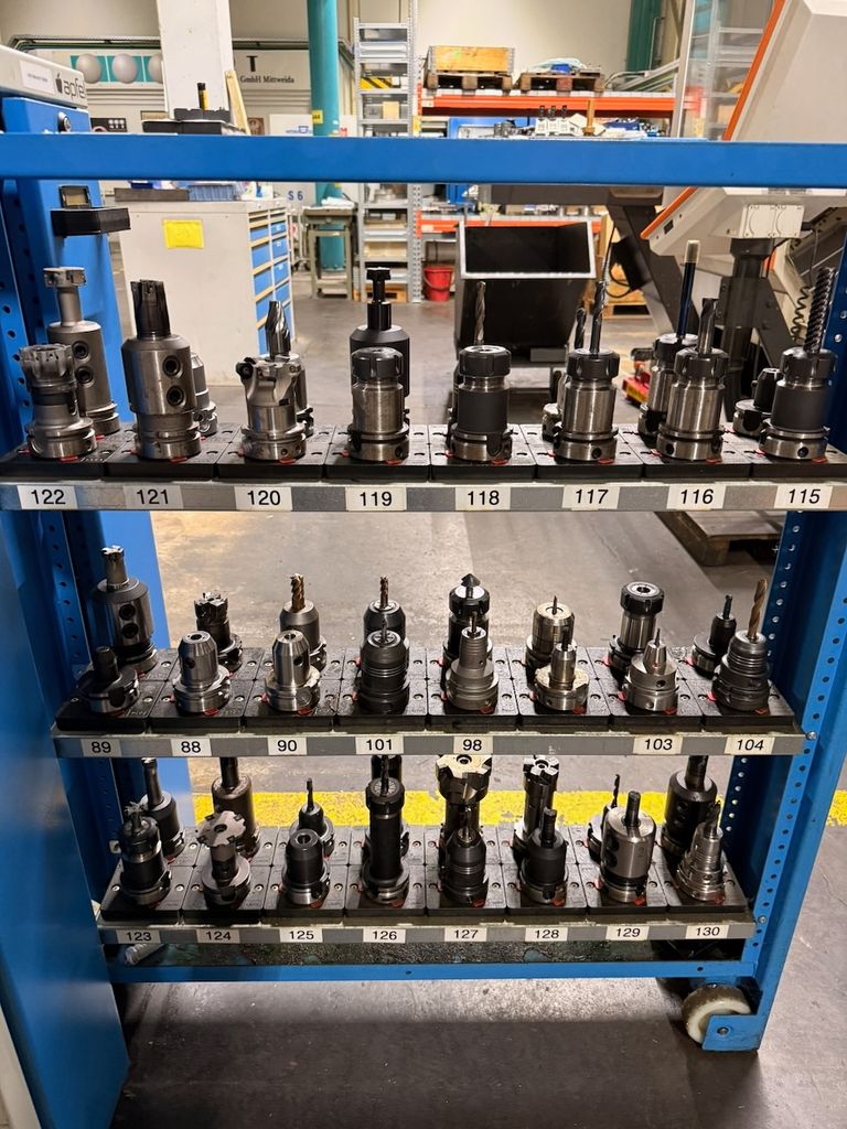 48× HSK-63 tool holders, mixed industrial stock: milling tool holders (Weldon), ER collet chucks, drill chucks, extensions, face mill/disc mill holders as well as various inserted cutters (solid carbide), drills, solid drills, etc. Tools partially mounted.