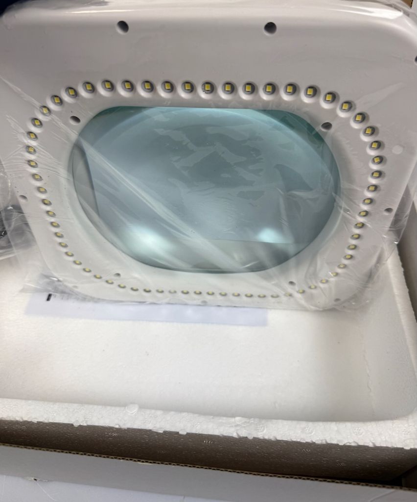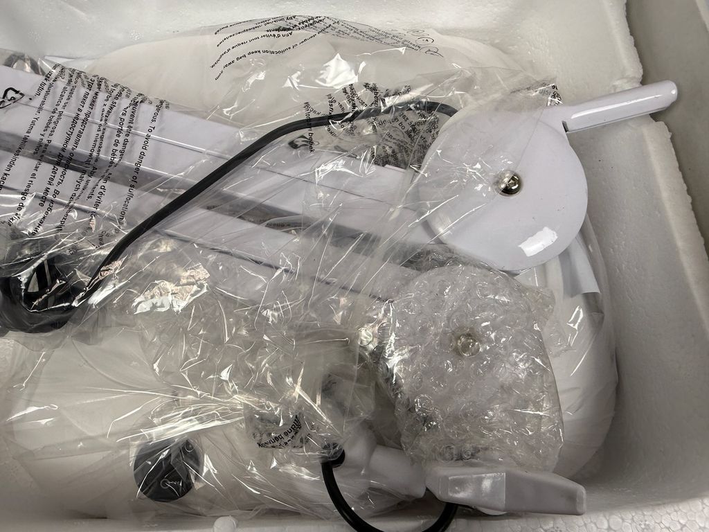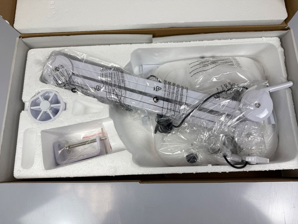 Articulated arm magnifying lamp with table clamp, original packaging.