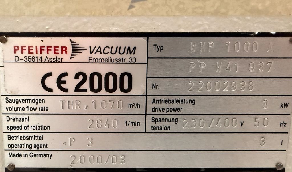DUO 250: 250 m³/h, 7.5 kW, 960/1155 1/min, Year 2000, SN 20033767; WKP 1000 A: 1070 m³/h, 3 kW, 2840 1/min, Year 2000, SN 22002938; DUO 20: 20 m³/h, Year 2003, SN 20218928