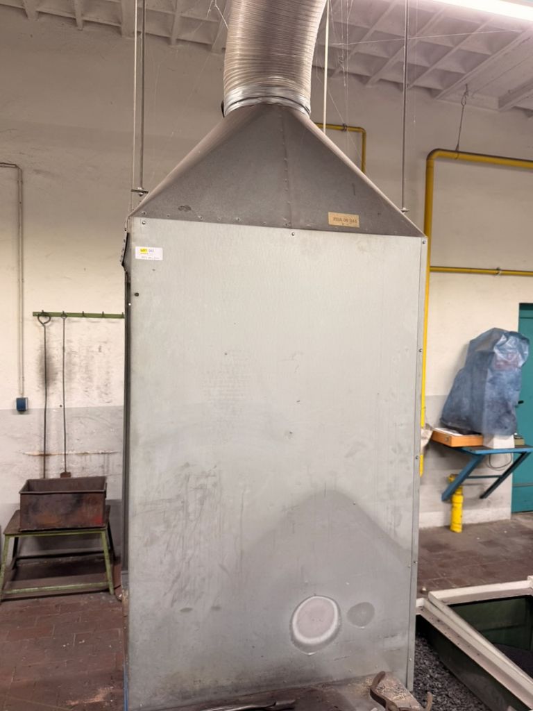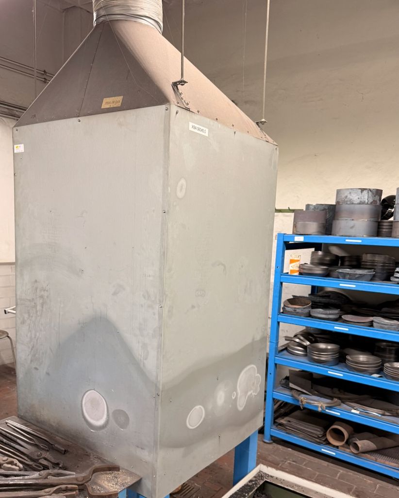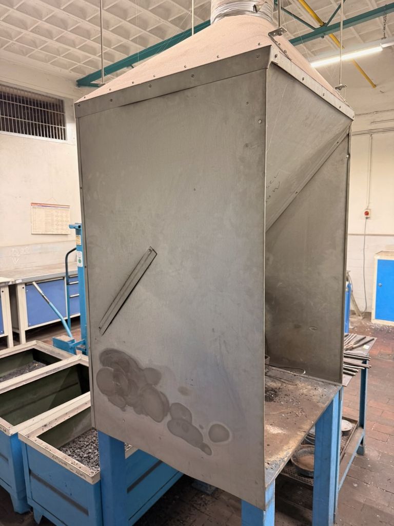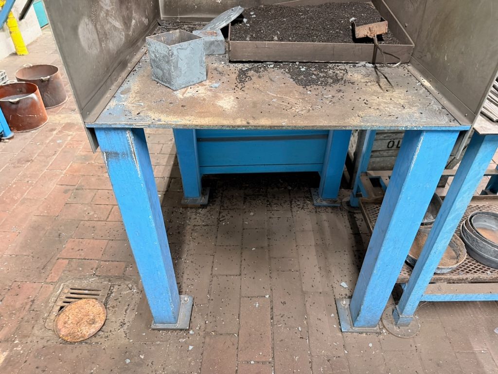 Industrial extraction table from a hardening shop with integrated extraction hood and connection nozzle for external extraction system. Designed for work with smoke, dust, and fumes, e.g., when removing, cooling, or reworking heat-treated workpieces. Massive steel construction with open work surface and rear intake grille. Sale without connected extraction technology.