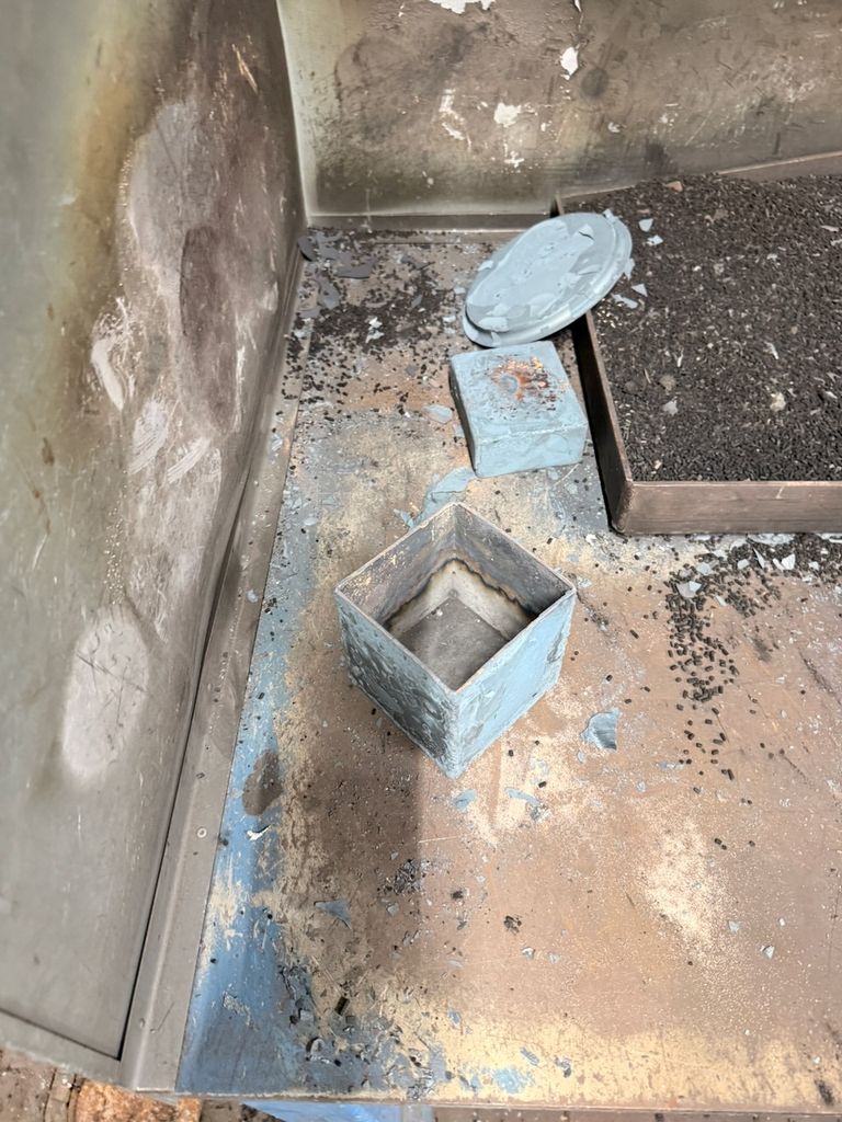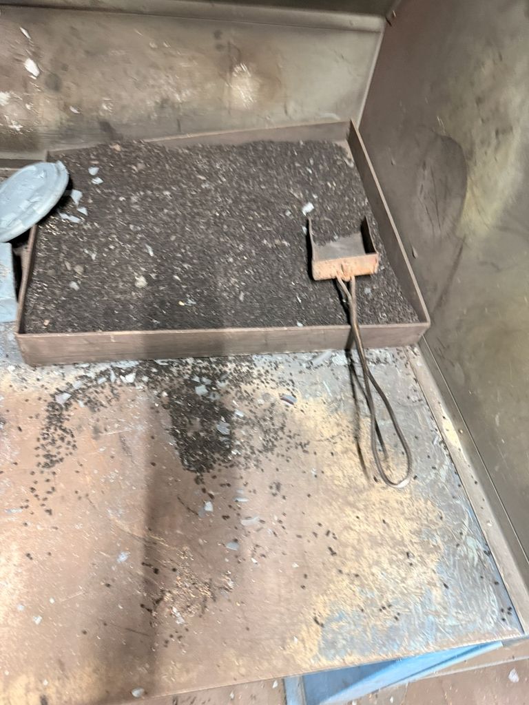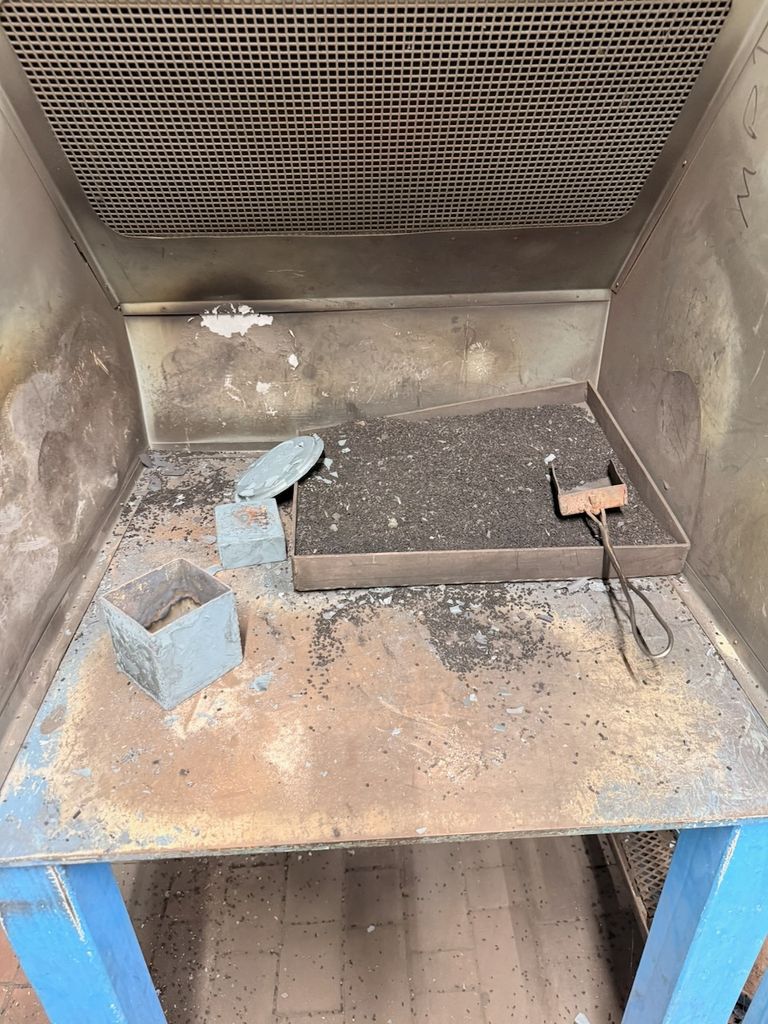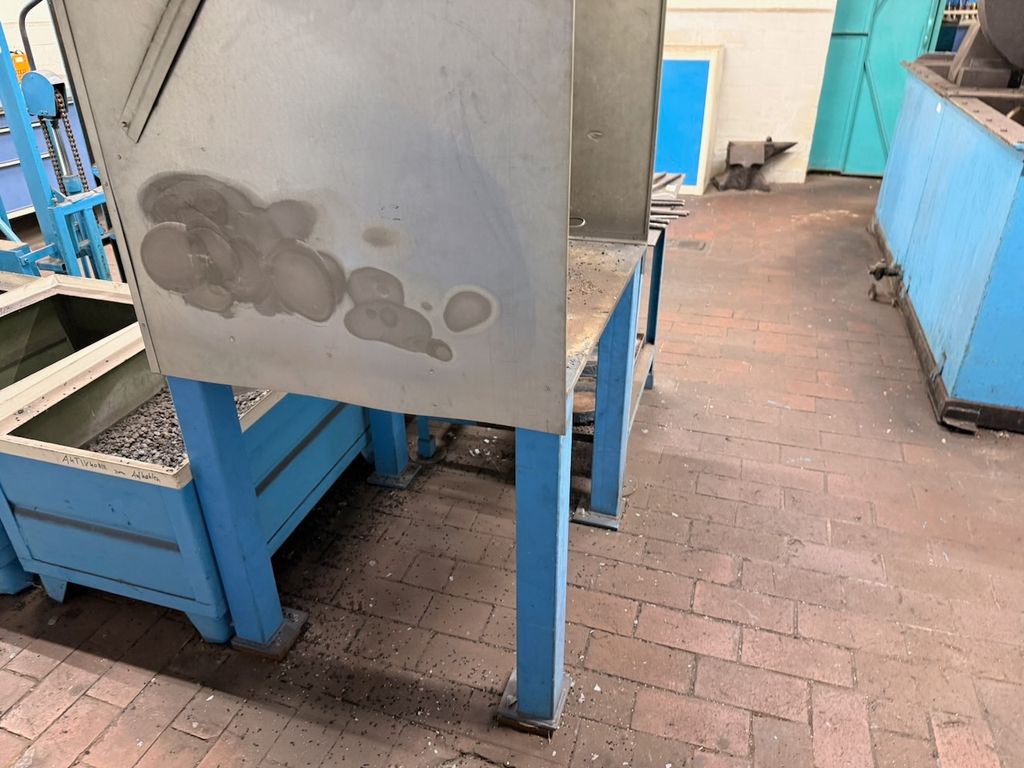 Industrial extraction table from a hardening shop with integrated extraction hood and connection nozzle for external extraction system. Designed for work with smoke, dust, and fumes, e.g., when removing, cooling, or reworking heat-treated workpieces. Massive steel construction with open work surface and rear intake grille. Sale without connected extraction technology.