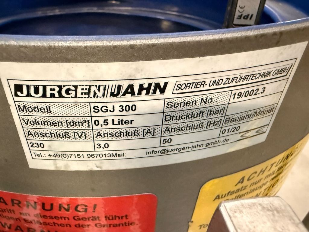 Complete feeding and sorting system from the manufacturer JAHN Fördertechnik, consisting of two fully functional feeding units. Each line contains a stainless steel spiral conveyor SGJ 300, a downstream linear feeder LFJ 3/550, and a storage bunker VBJ 5/40 for automatic parts storage. All six associated JAHN control devices (bunker, bowl, rail) are present. The system was dismantled from an industrial assembly line and is technically complete.