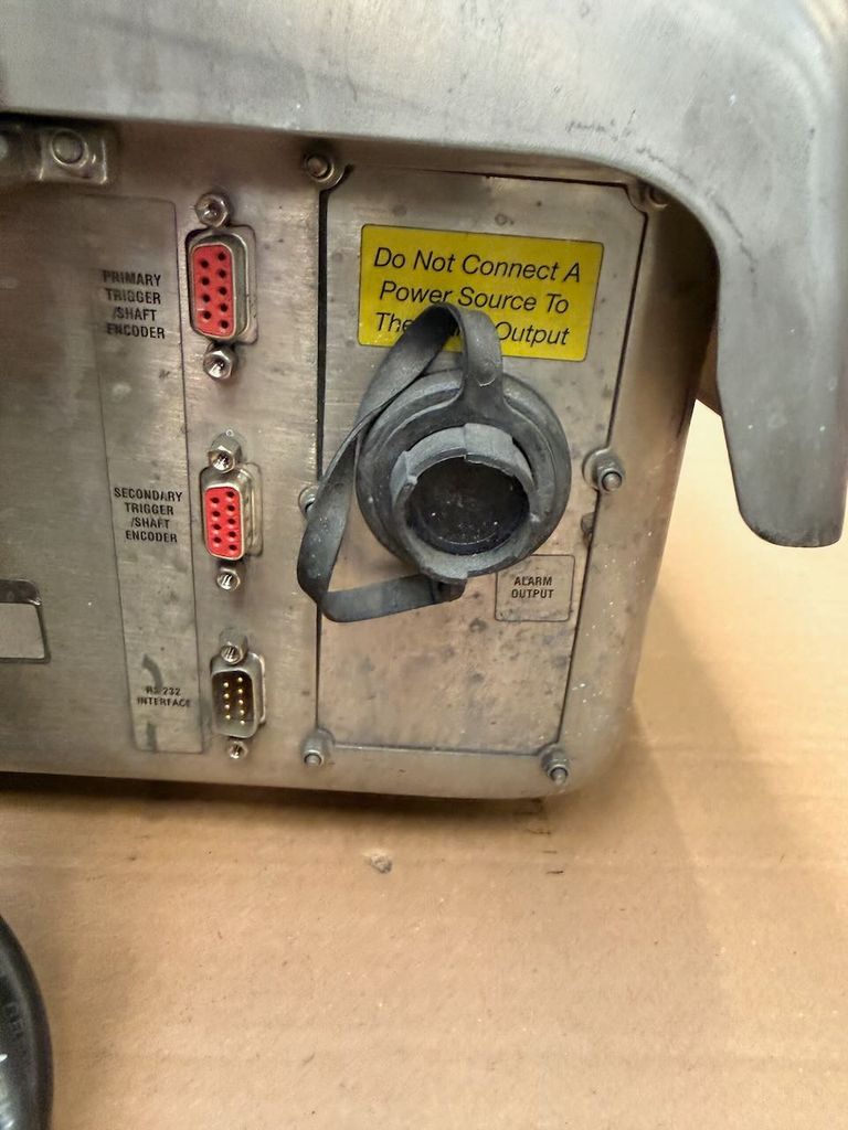 Connection panels: RS-232 interface, trigger/shaft encoder (primary/secondary), alarm output