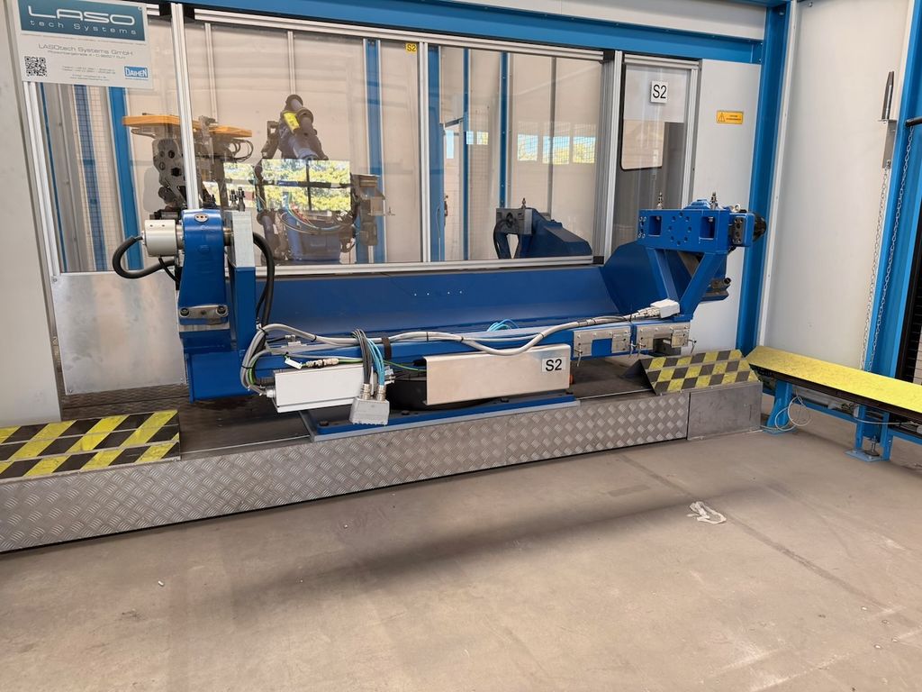 YASKAWA Positioner V2-500D3 L = 1650 Serial number: 466843-1-1 | Year of manufacture: 2022 | Weight: 1,409 kg | Article number: 411503 | Part No.: 148548-100 (Yaskawa Nordic AB, Sweden) Equipment: Servo rotary axis, swivel unit, Penlink rotary union (P/N 365003 – S/N 3197). Total unit weight: approx. 1,500 kg. Project assignment: LASO Tech, Project No. 30101293. Welding cell LASO WP-SLK Steel frame construction with safety enclosure, electrically locked accesses. Integrated positioning systems (S1 / S2). Control LASO Industrial PC / Siemens S7 / Robot control YASKAWA Motoman-compatible. Power supply 400 V / 50 Hz / 138 kVA. Process control for resistance spot welding with cooling water, compressed air, and network interfaces. I/O wiring fully available.