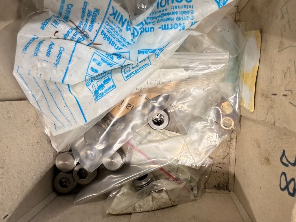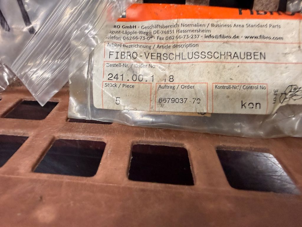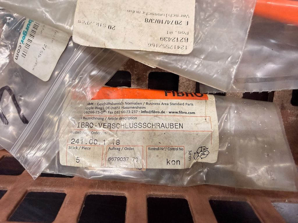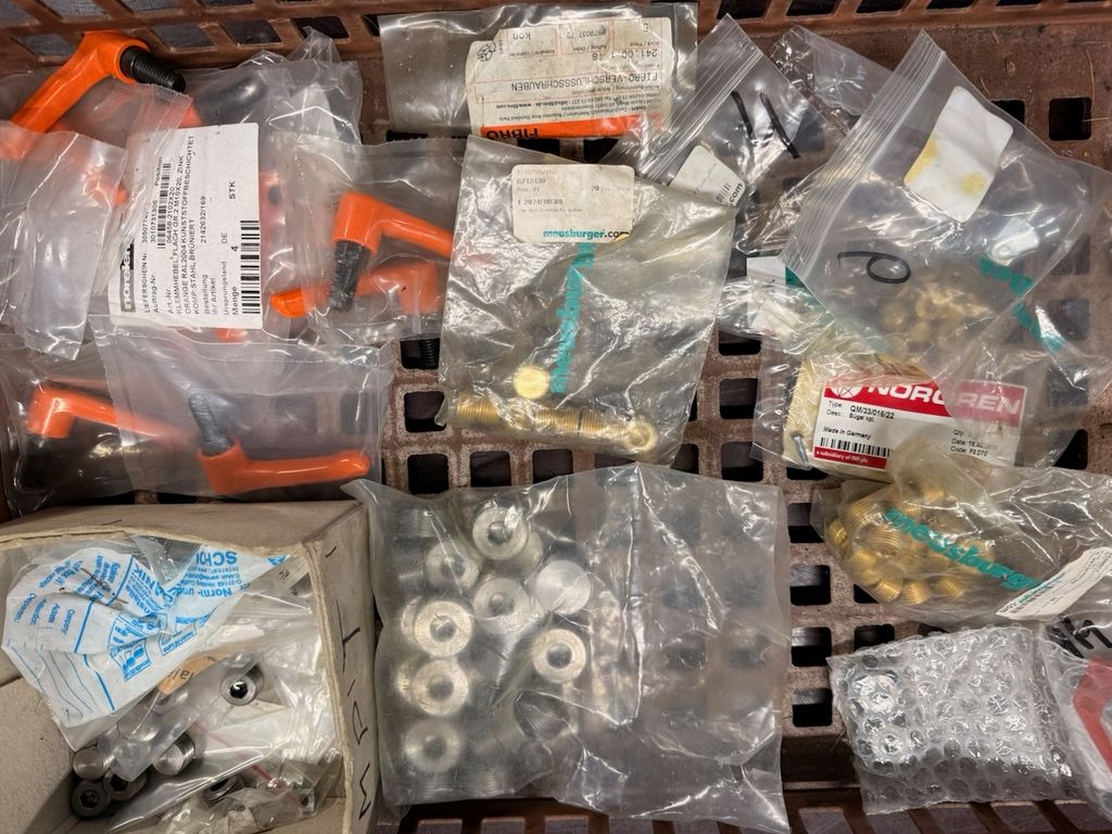 Mixed lot of standard parts, fastening elements, and machine components, mostly new, largely in original packaging. Included are, among others: