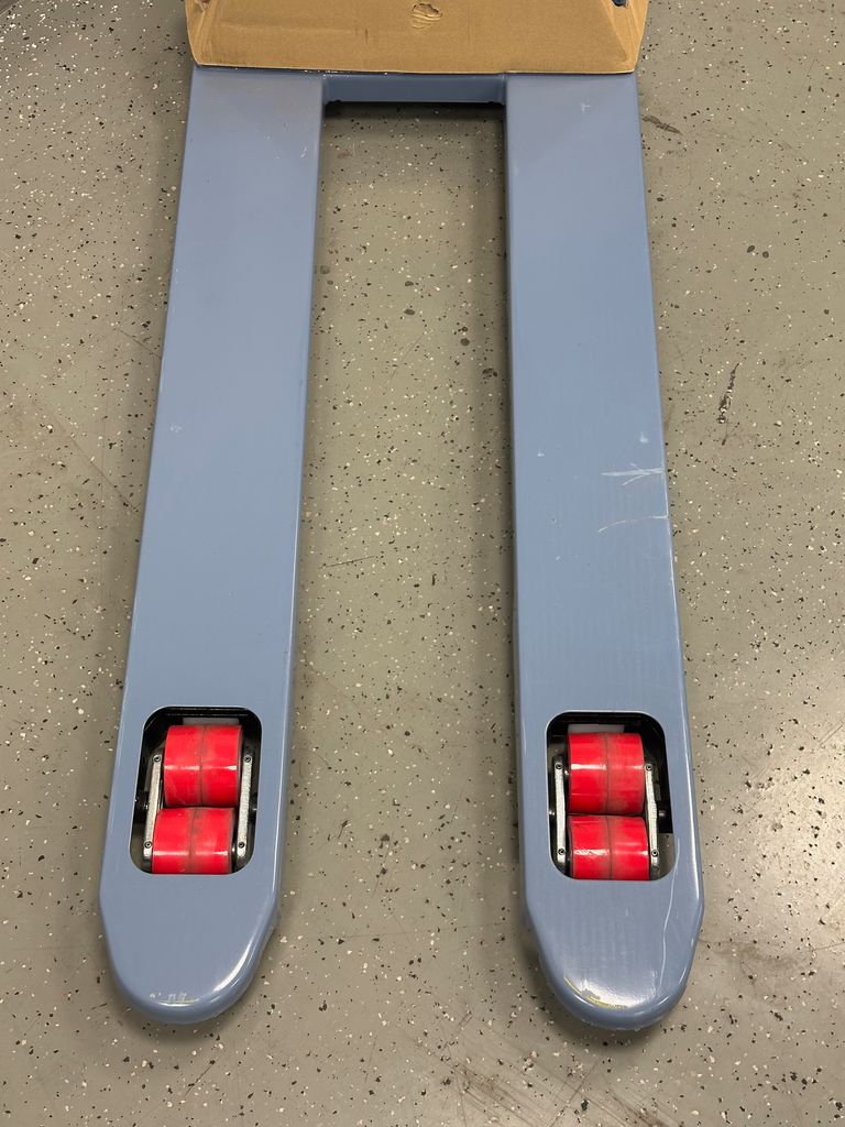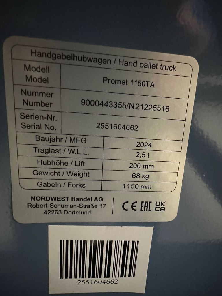 Promat 9000443355 pallet truck fork length 1150mm load capacity 2500kg steel pigeon blue PUR rollers