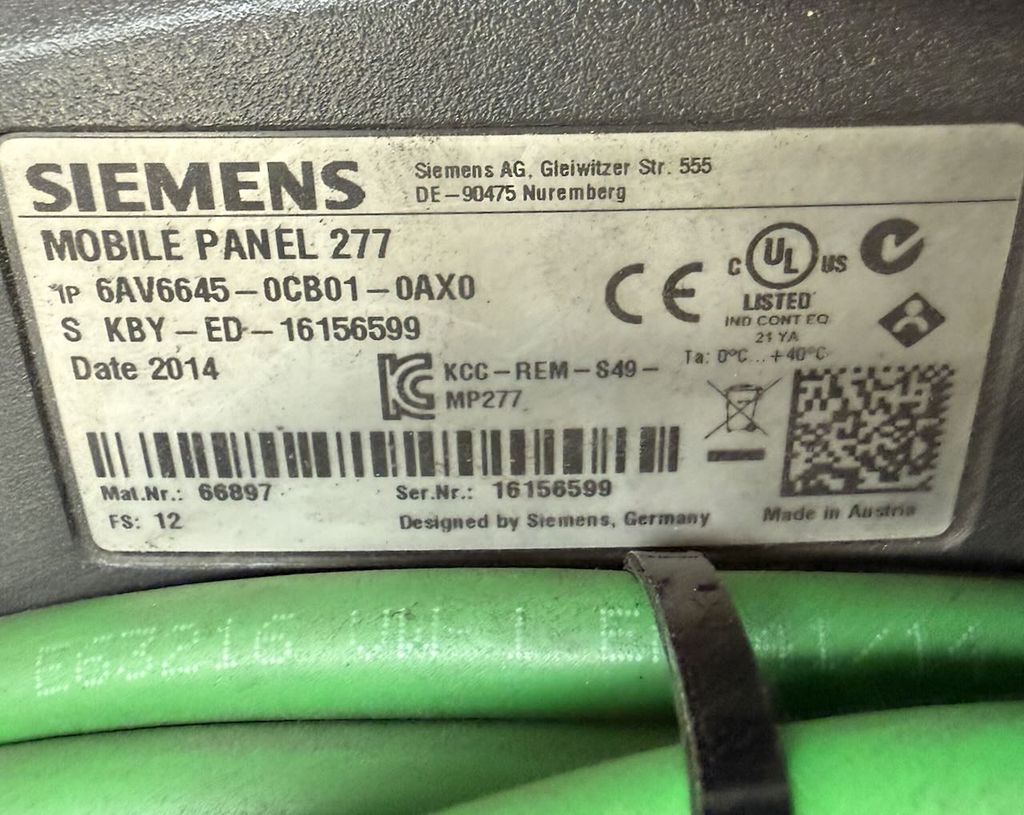 Siemens SIMATIC Mobile Panel 277 + Connectivity Box Component Description Operating/Handheld Device: Siemens SIMATIC Mobile Panel 277 Nameplate: 1P 6AV6645-0CB01-0AX0 Serial No.: 16156599 Year of Manufacture: 2014 Manufacturer: Siemens AG, Gleiwitzer Str. 555, DE-90475 Nuremberg Accessories: Siemens Connectivity Box PN Plus Nameplate: "1P 6AV6 671-5AE11-0AX0" Communication Interface (Profinet) for the Mobile Panel