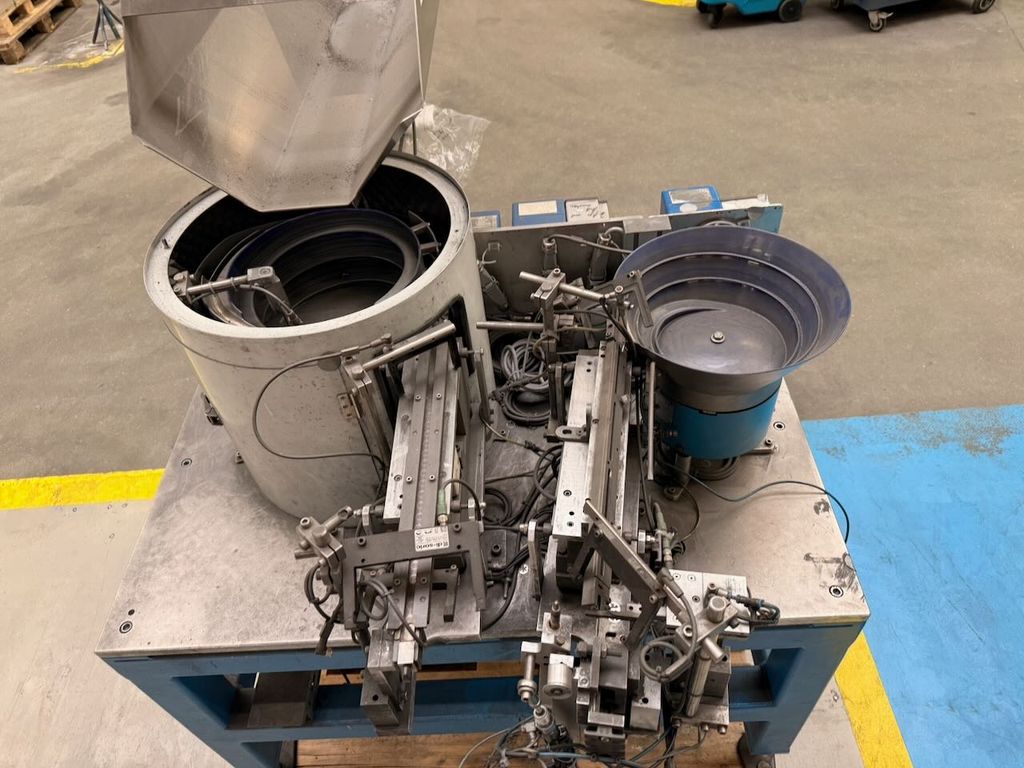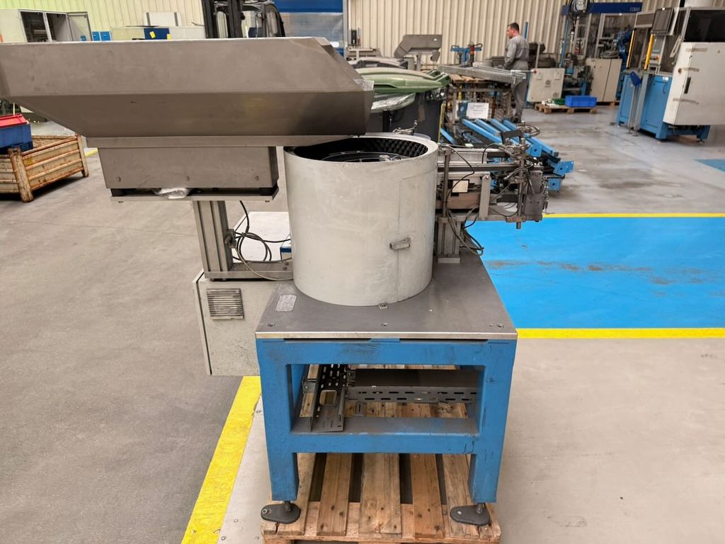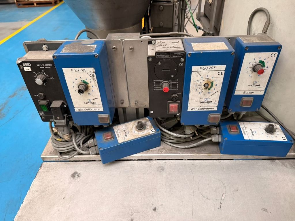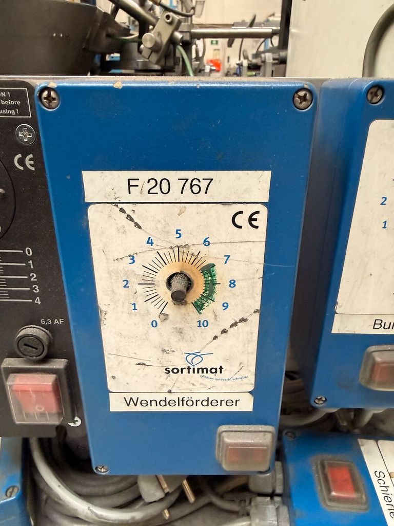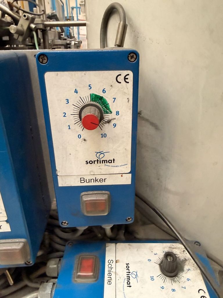 1. Sortimat Bowl Feeder (large) Machine No.: L00F20761 Year of manufacture: 08/2010 Diameter approx. 340 mm Completely enclosed housing With stainless steel hopper (large feed tray) Internal soundproofing 2. Sortimat Bowl Feeder (small) Diameter approx. 300 mm Vibration drive via Sortimat control unit For small parts feeding 3. Stainless Steel Hopper Feed Large stainless steel feed trough Length approx. 80–90 cm Automatic feeding into the large bowl feeder 4. Pneumatic Separation and Linear Technology Several pneumatic positioning units Linear rails Separation slides Limit switches, sensors Ideal for screws, bolts, fittings, pins, etc. 5. Control / Electrical Included control units (all mounted): 2× Sortimat Bowl Feeder Controls F20765 / F20767 1× Sortimat Hopper Control Unit 1× RED Revoplus Vibration Control 1× Sortimat Switching Unit Electrical connection: 230 V / 50 Hz