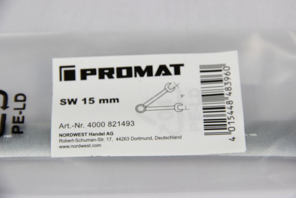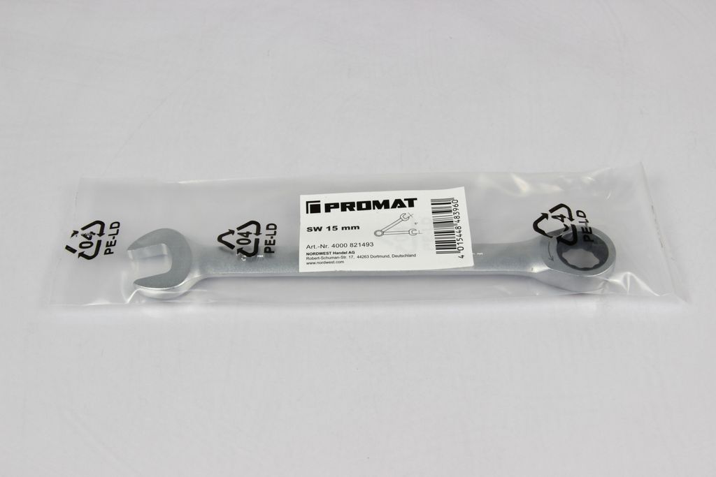 This PROMAT open-end ring ratchet wrench is an indispensable quality tool for efficient work on machines, vehicles, and technical systems. With a wrench size of 15 mm and an overall length of 200 mm, it offers an optimal balance between leverage and compactness. The ring side features a high-quality, fine-toothed ratchet mechanism that enables quick fastening even in confined spaces, without having to reposition the wrench. Its straight design guarantees direct power transmission and maximum stability for professional applications.