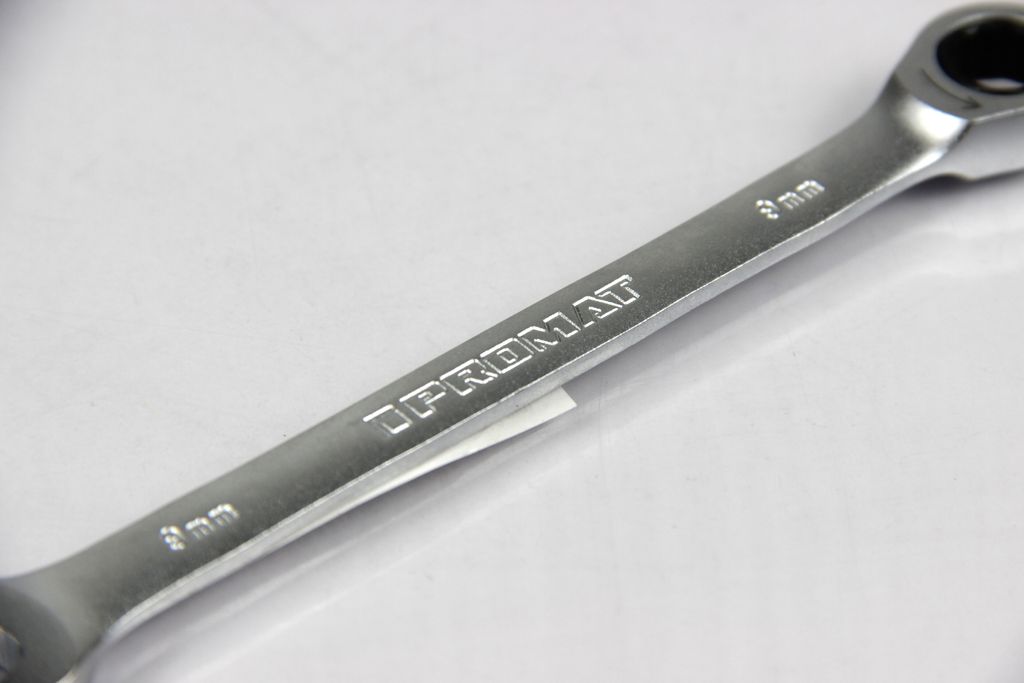 This PROMAT open-end ring ratchet wrench is a high-quality tool for precise screwing tasks in industry, trade, and automotive sectors. With a wrench size of 9 mm and a compact length of 143 mm, it is ideal for working in hard-to-reach places where conventional ratchets or wrenches are too bulky. The ring side is equipped with a fine-toothed ratchet mechanism, which allows for a small return angle and thus guarantees efficient work in the tightest spaces. In its straight design, the wrench offers optimal power transmission and handling for professional requirements.