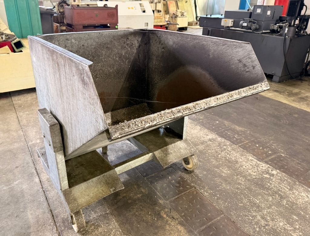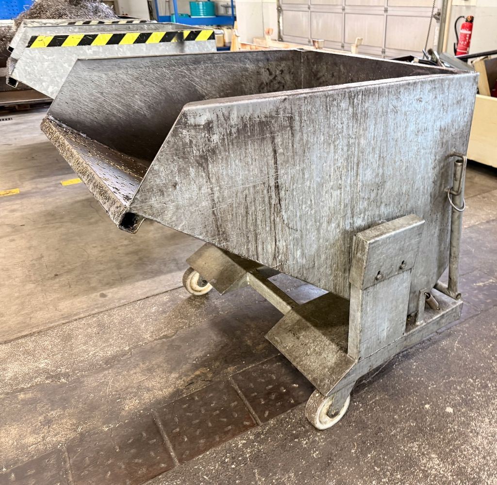 Gebrauchter Kippbehälter aus verzinktem Stahl, geeignet für Späne, Schrott und sonstige Schüttgüter.