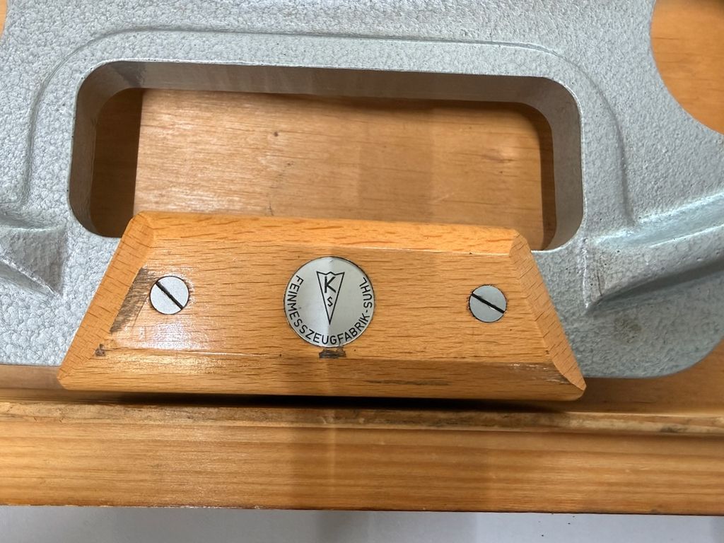 Außen-Bügelmessschraube (Großmikrometer) der Feinmesszeugfabrik Suhl im originalen Holzkasten.