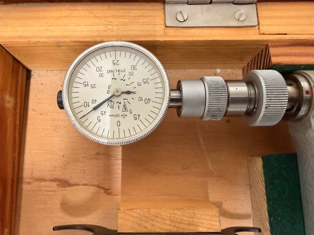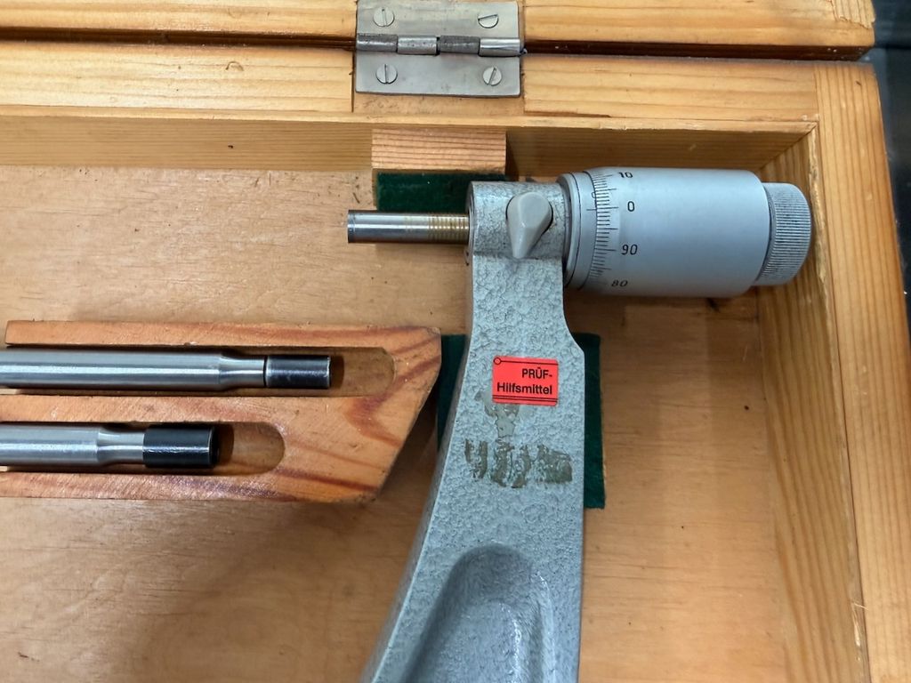 Gebraucht. Alters- und nutzungsbedingte Gebrauchsspuren am Bügel und an der Oberfläche vorhanden. Messflächen optisch ordentlich. Messuhr vorhanden und mechanisch vollständig. Keine Kalibrierung oder messtechnische Prüfung durchgeführt. Holzkasten mit üblichen Gebrauchsspuren, insgesamt stabil.