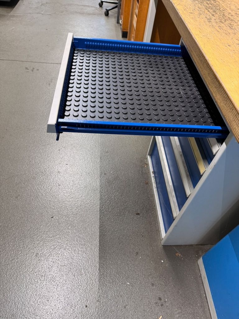 Werkbank mit integrierter Schubladeneinheit aus Metall mit aufgesetzter Holzarbeitsplatte.