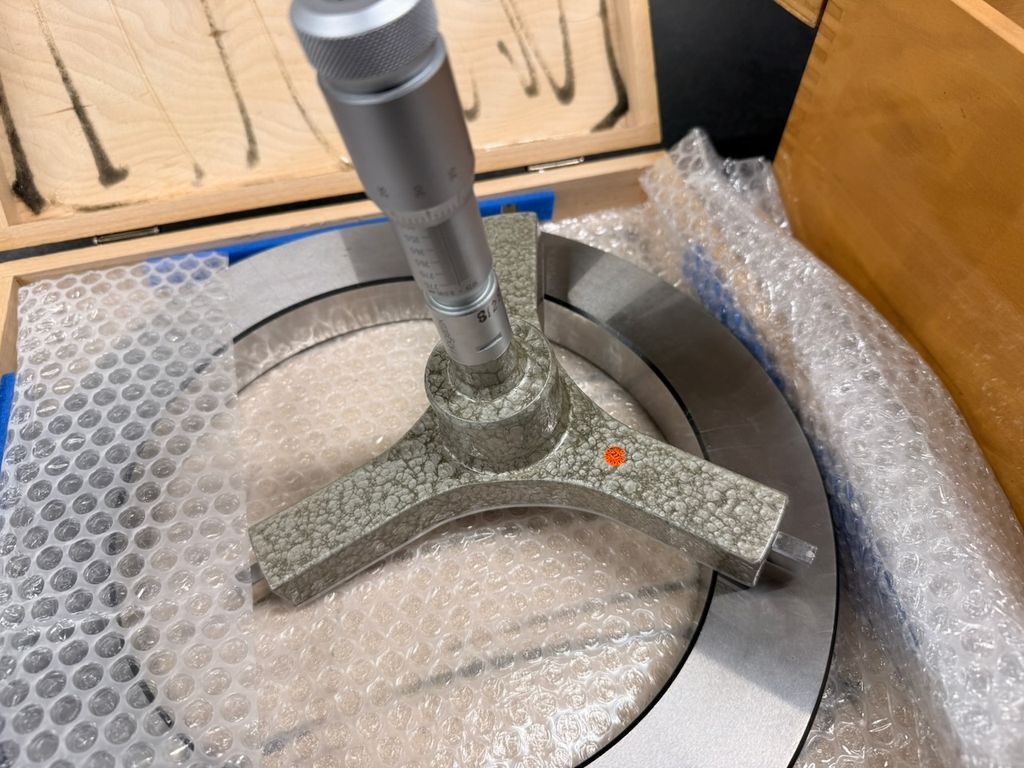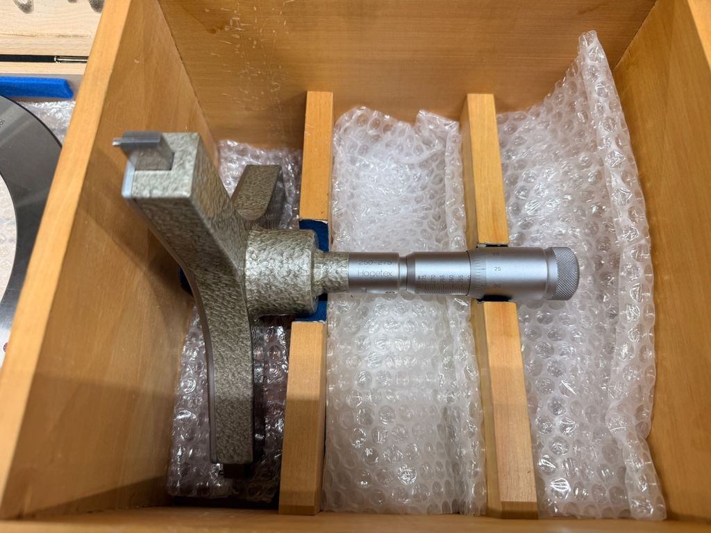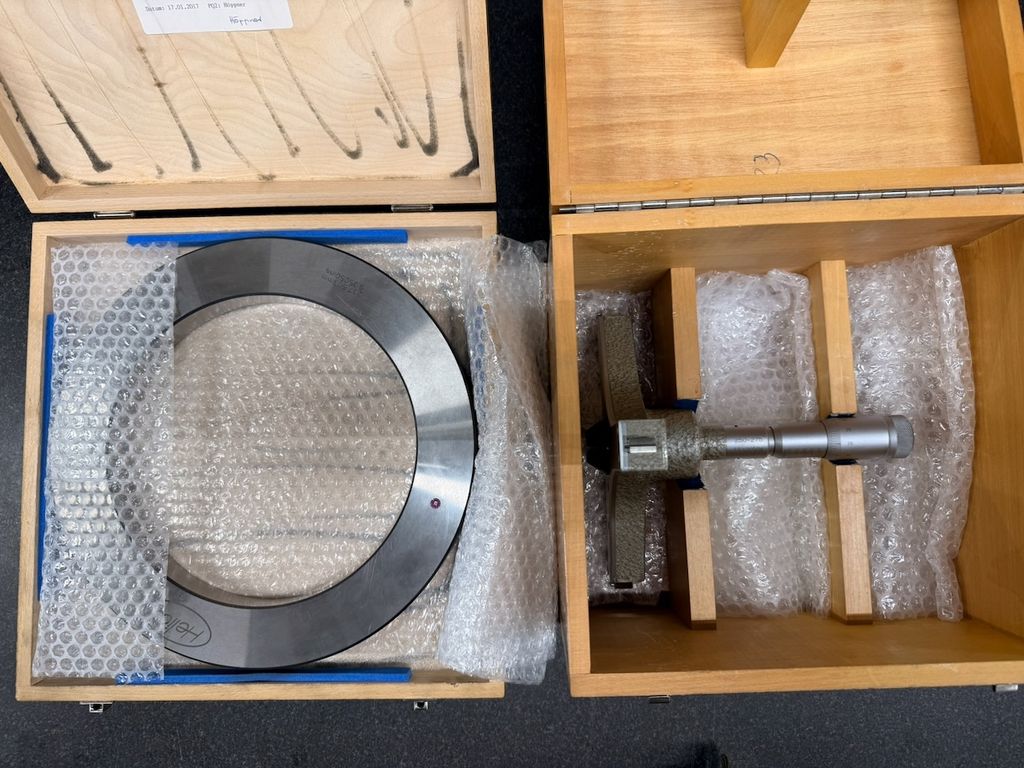Gebraucht. Messgerät und Einstellring in gutem, gepflegtem Zustand mit leichten Gebrauchsspuren. Holzkästen deutlich gebraucht. Keine aktuelle, rückführbare Kalibrierung.