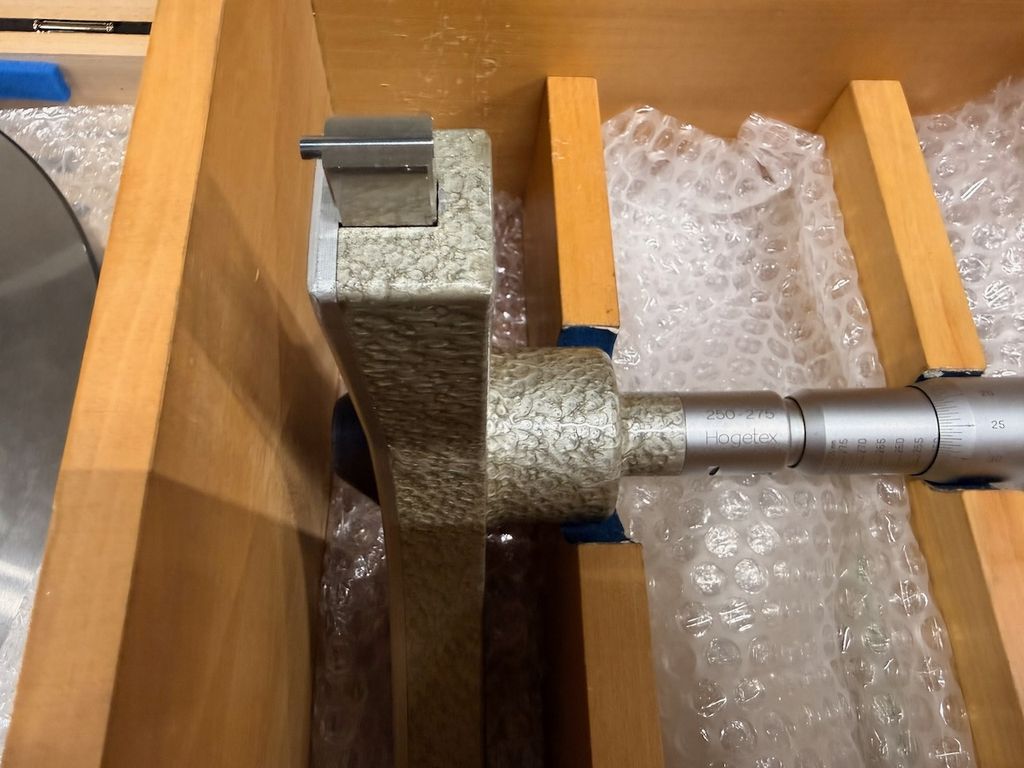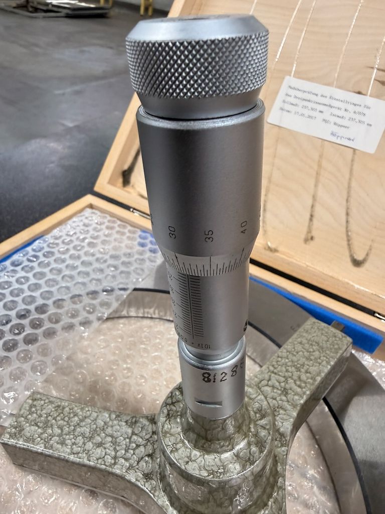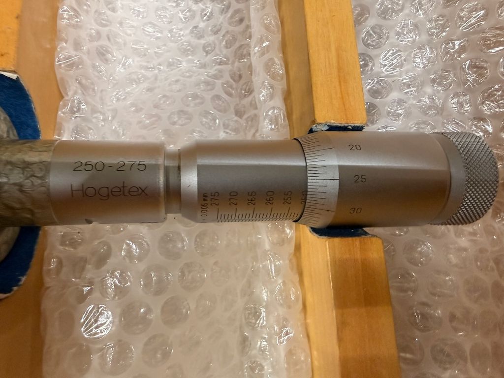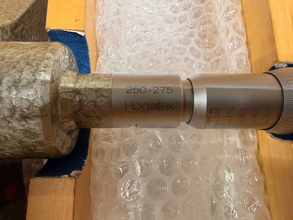 Hogetex 3-Punkt-Innenmessgerät für den Messbereich 250–275 mm. Zum Set gehört der passende Einstellring Ø 237,503 mm. Messgerät und Einstellring werden jeweils im originalen Holzkasten geliefert.