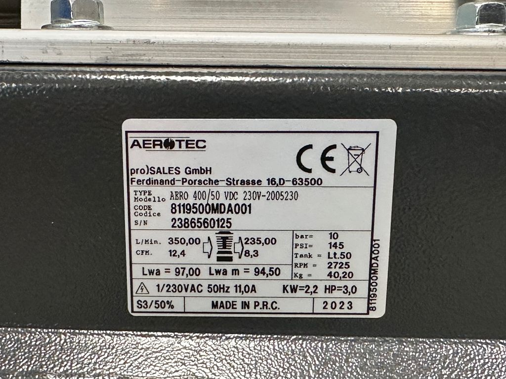 AEROTEC AERO 400/50 VDC Kolbenkompressor 2‑Zylinder V‑Aggregat 50l 350l/min 10bar ölgeschmiert 230V