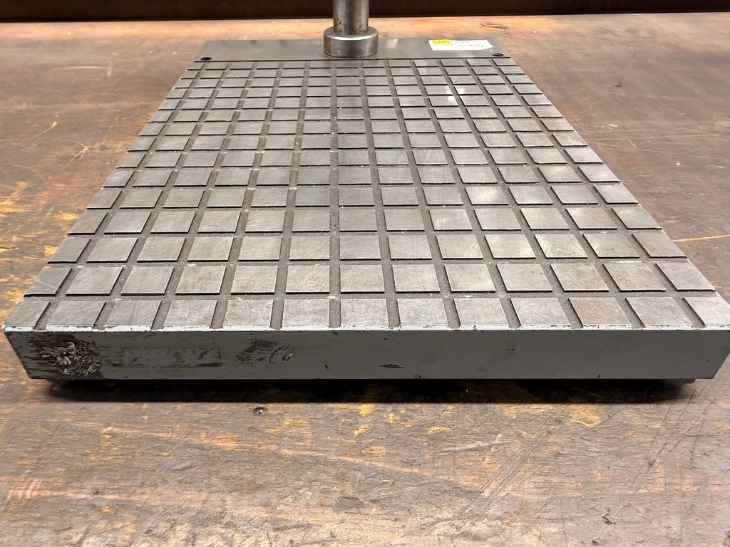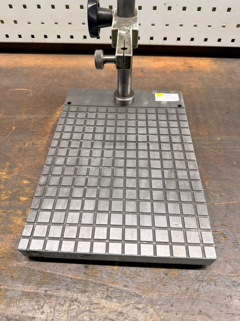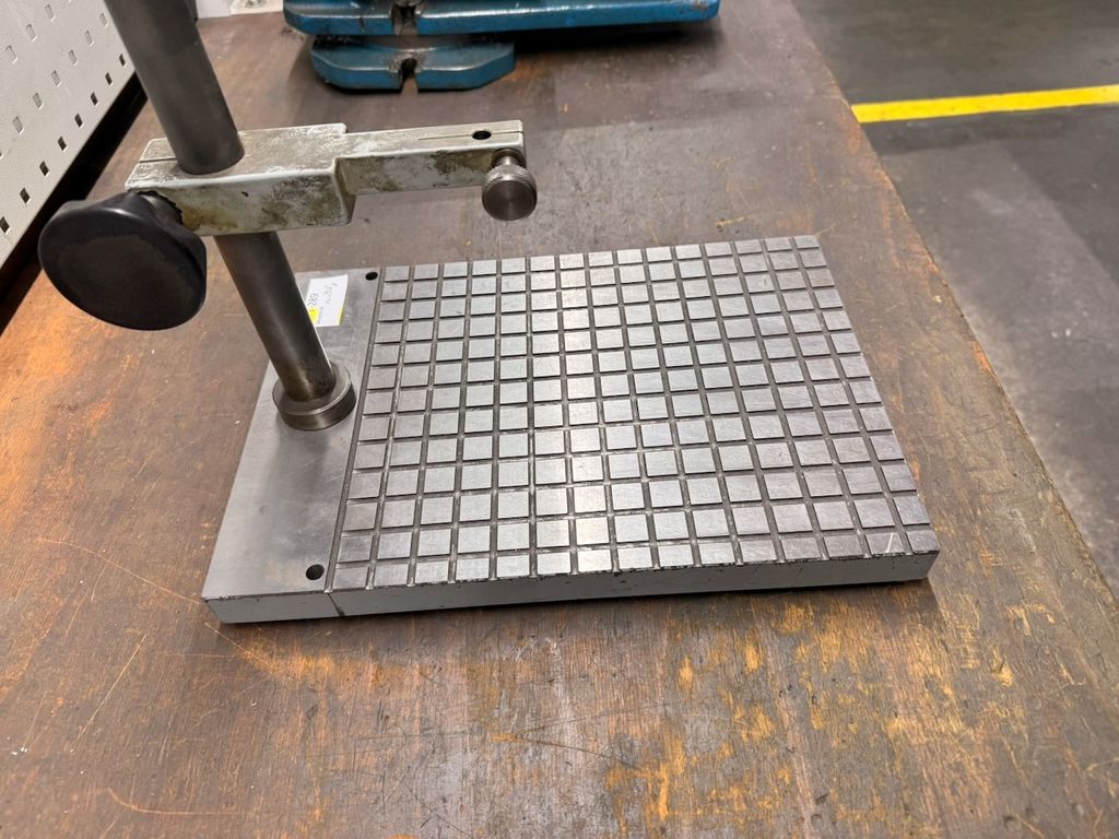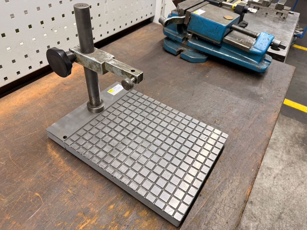 Gebrauchte Anreiß- bzw. Messplatte mit aufgesetztem Stativ und verstellbarem Halter, geeignet für Anreiß-, Prüf- und Messarbeiten im Werkzeug- und Maschinenbau.