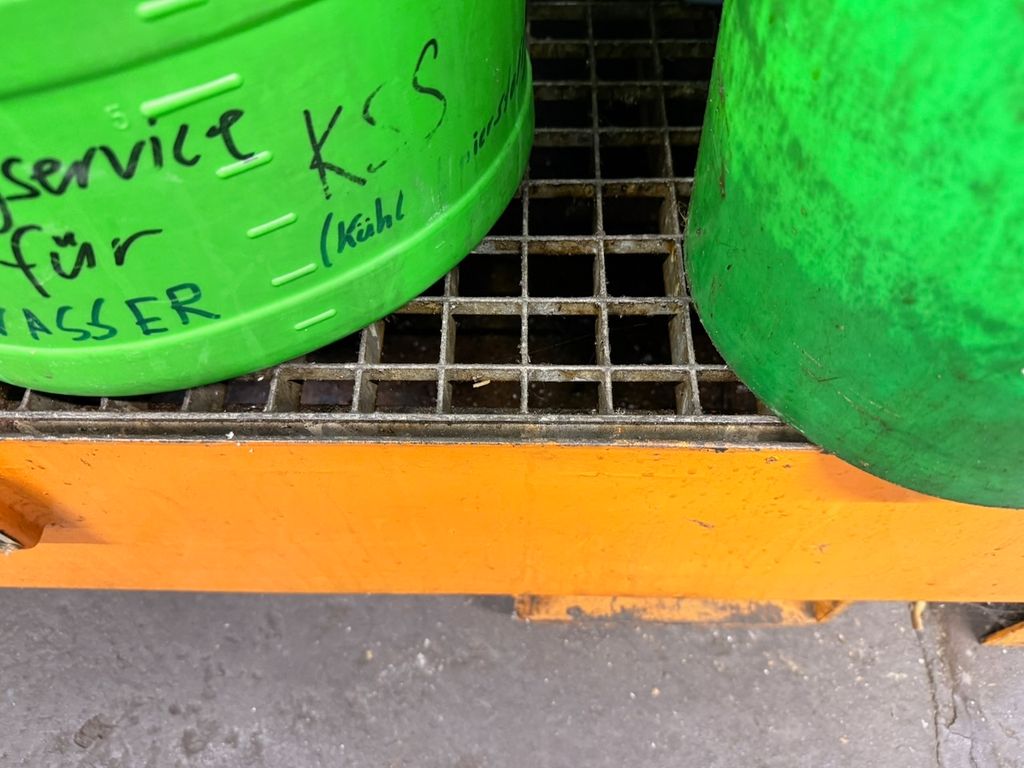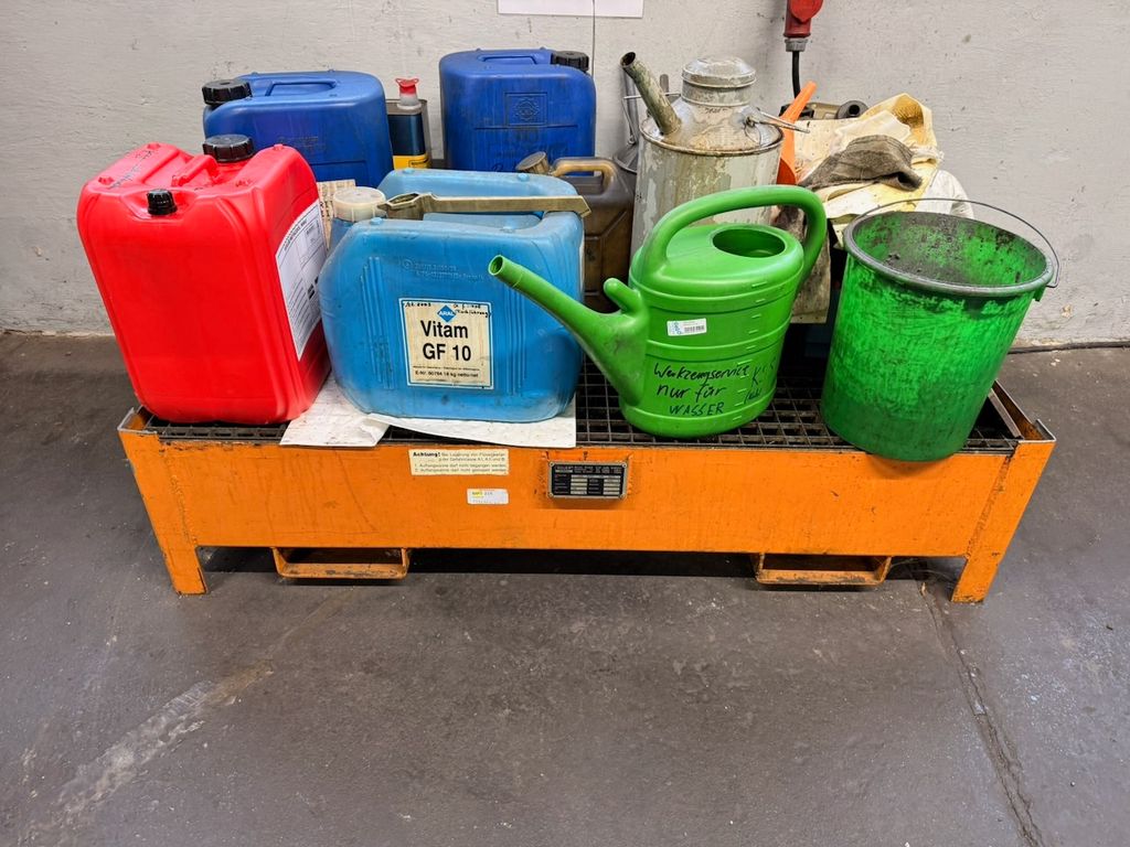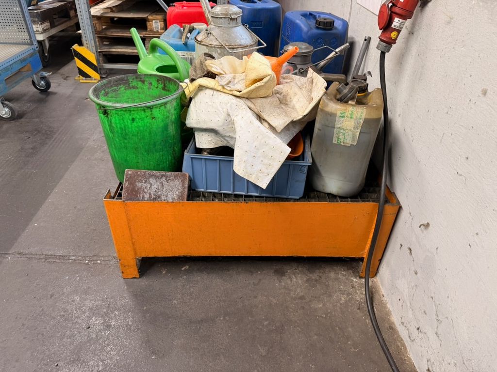 Stationäre Auffangwanne aus Stahl zur Lagerung von Flüssigkeitsbehältern. Geeignet zum Auffangen von Leckagen und Tropfverlusten. Ausführung mit Gitterrost. Gebraucht, mit alters- und nutzungsbedingten Gebrauchsspuren (Lackabplatzer, Verschmutzungen).